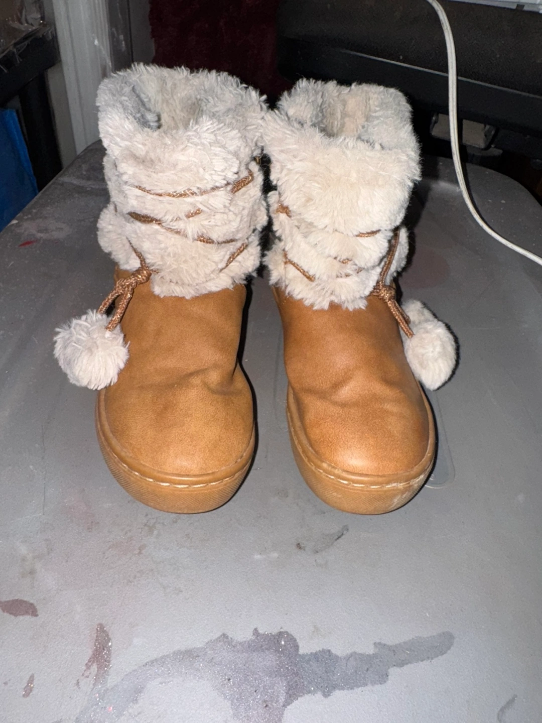Cozy Justice brand winter boots for girls, size 1. These brown boots feature a faux fur trim and pom-pom details, perfect for keeping little feet warm and stylish during the colder months