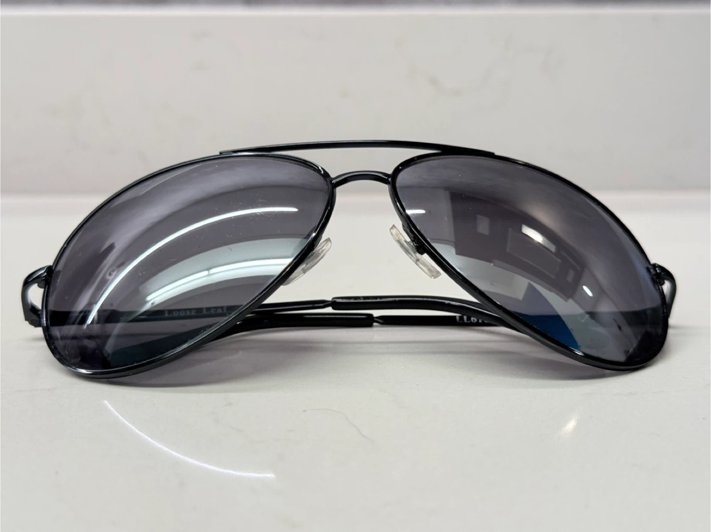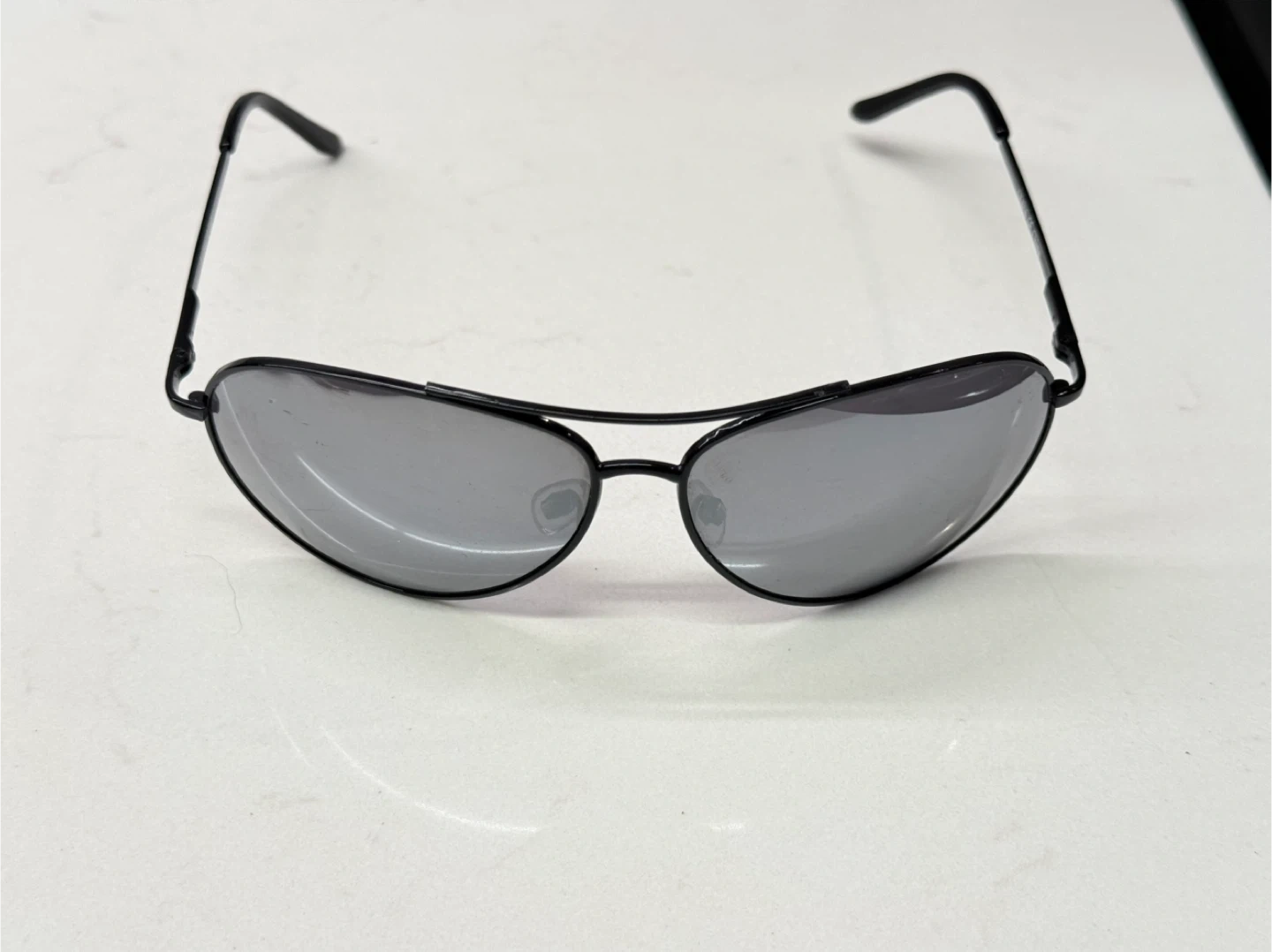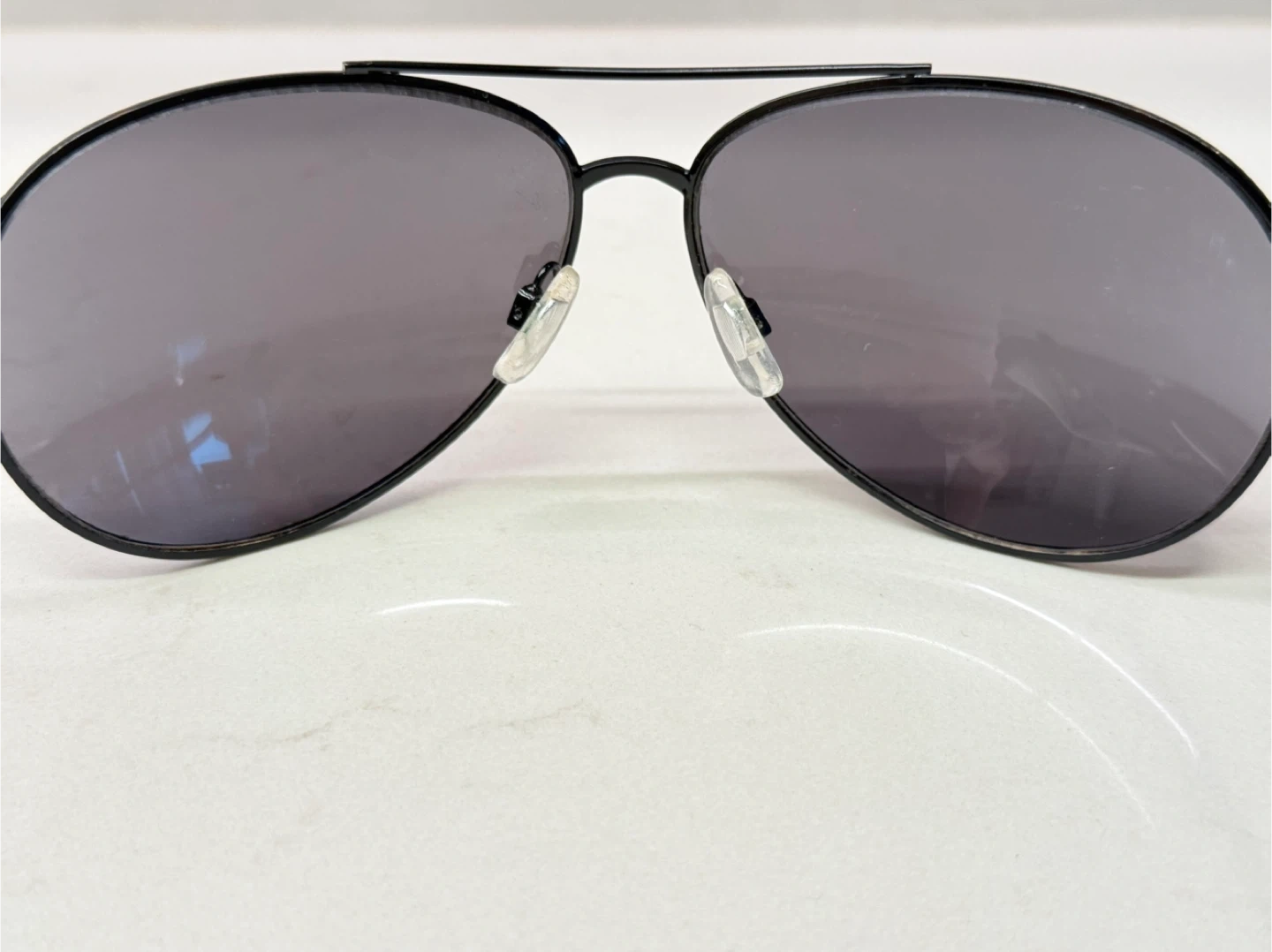 Selling a pair of classic aviator sunglasses with a black frame. They're in great condition except for the scratches at the lenses… not too bad but discontinued because of it!