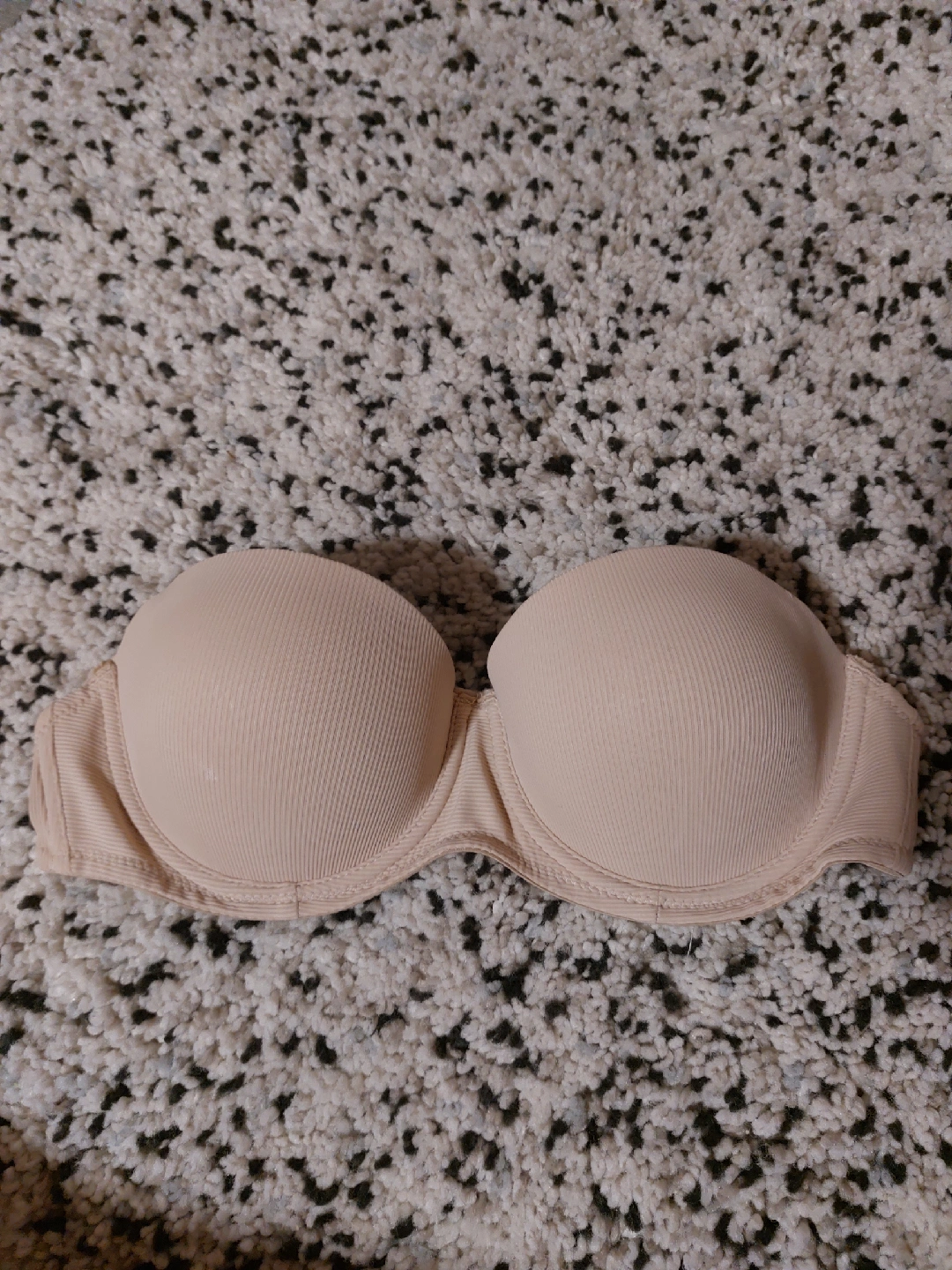 This is a beige strapless bra in good condition. Perfect for summer outfits or any occasion where you need a seamless look under your clothes. It looks to be a size 34B