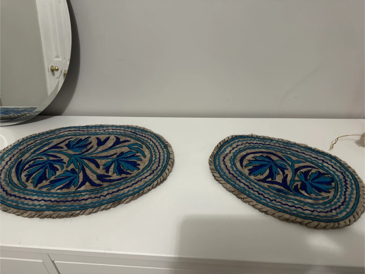 Selling a set of three handmade embroidered table mats. They feature a beautiful floral design in shades of blue and beige. These mats are perfect for adding a touch of handcrafted charm to your dining table or coffee table!