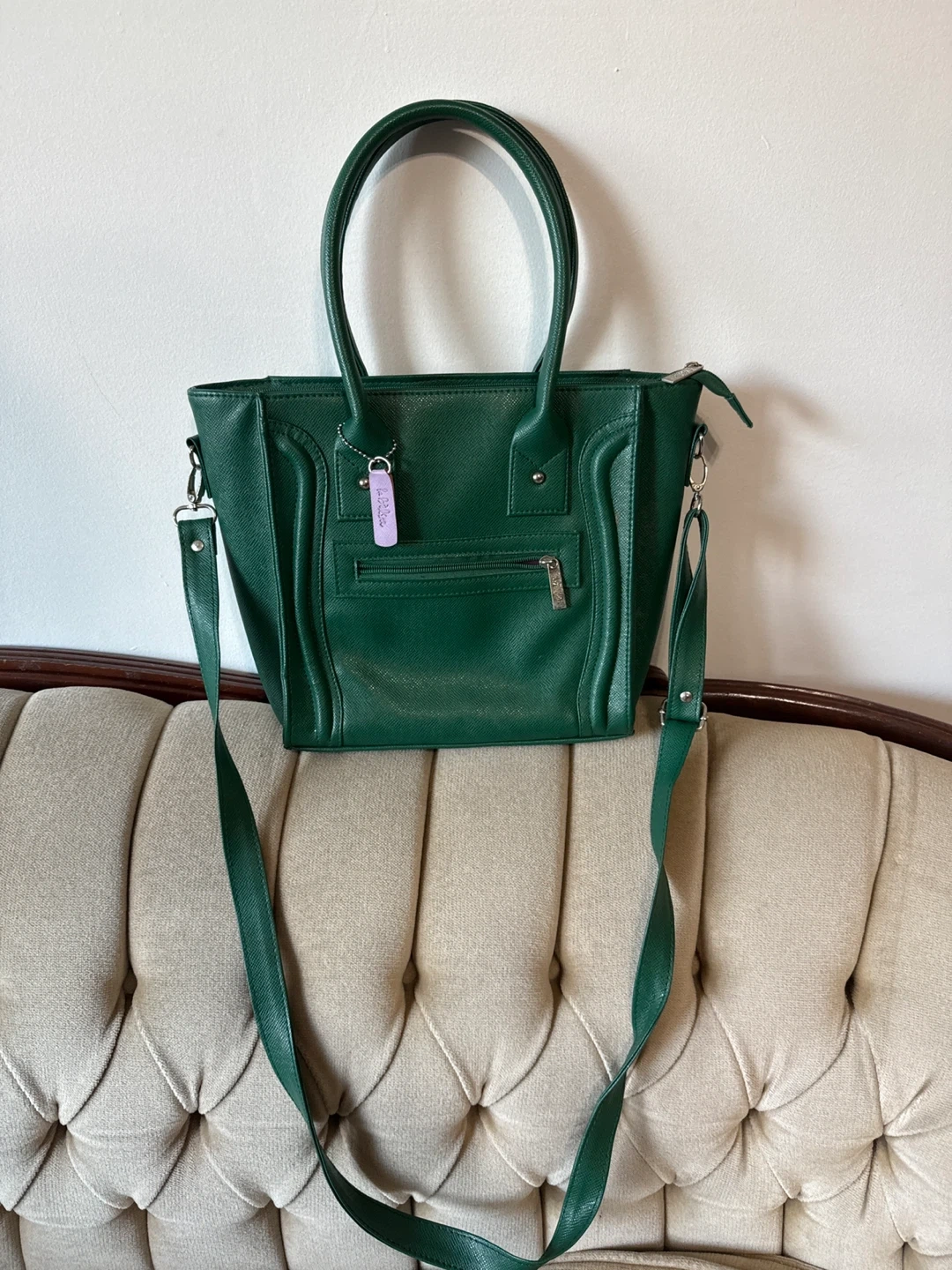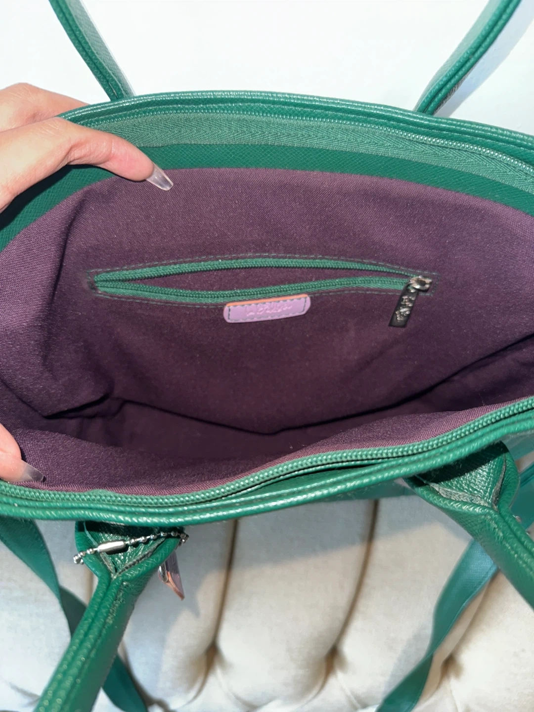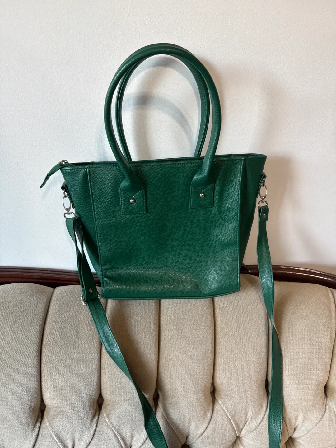 A lovely green tote bag It's in great condition and ready for a new home. Perfect for carrying your essentials in style. The colour is a beautiful deep green, and it has a nice interior lining too!