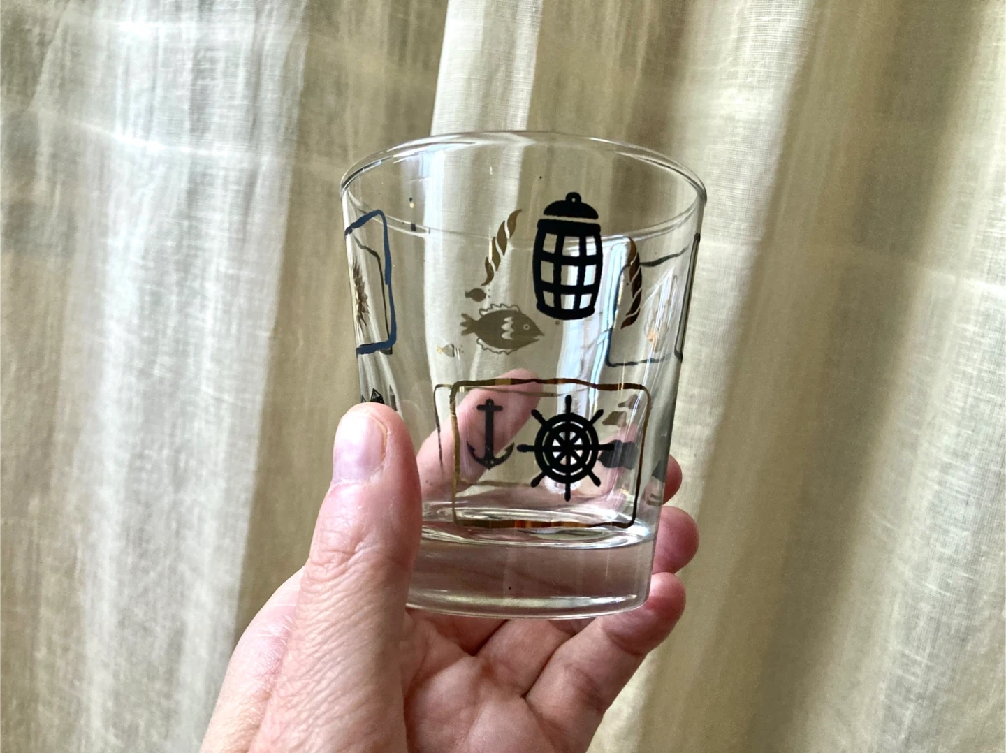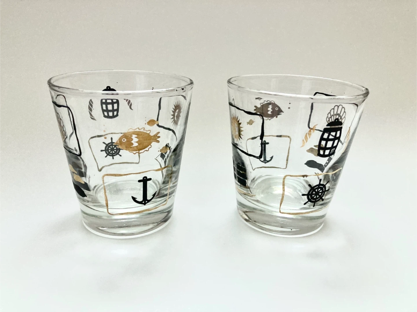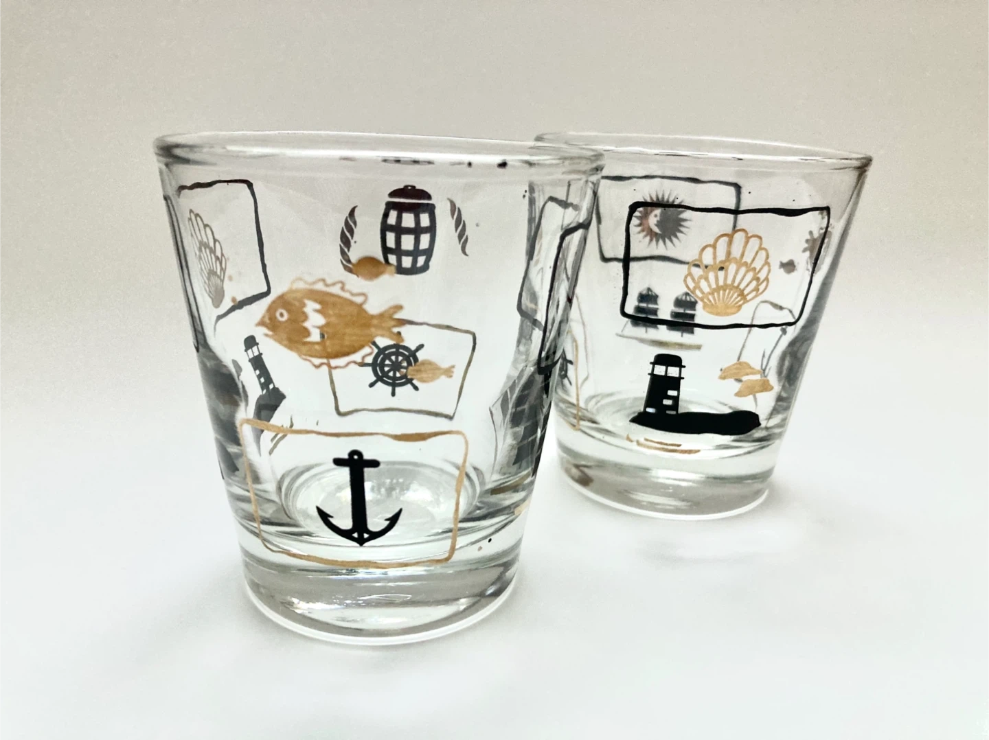 This pair of vintage glasses feature charming black and gold nautical graphics showcasing designs of a lighthouse, seashell, ship, ship’s wheel, anchor, fish, the sun, and ship’s lantern. Each glass holds six ounces, perfect for your favorite cocktails. Ideal for coastal-themed decor, cocktail enthusiasts, or collectors of Canadian-made glassware. About 3.5” tall. Pick up in the Ossington and Davenport area. Check my other listings for more vintage home decor, and barware.