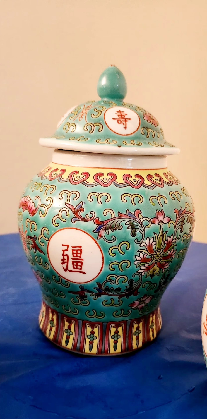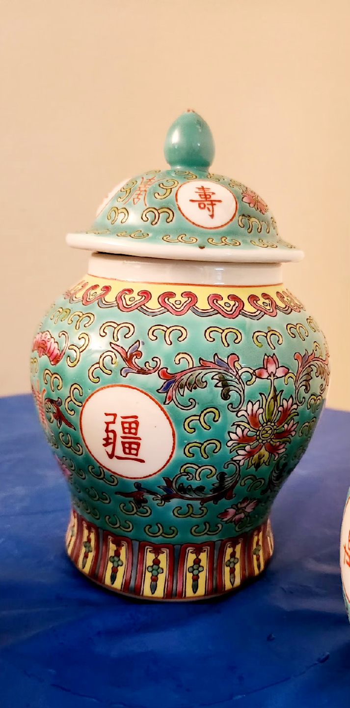 Selling a set of three vintage Chinese ginger jars. These decorative jars feature intricate floral designs and Chinese characters. They would make a lovely addition to any home!