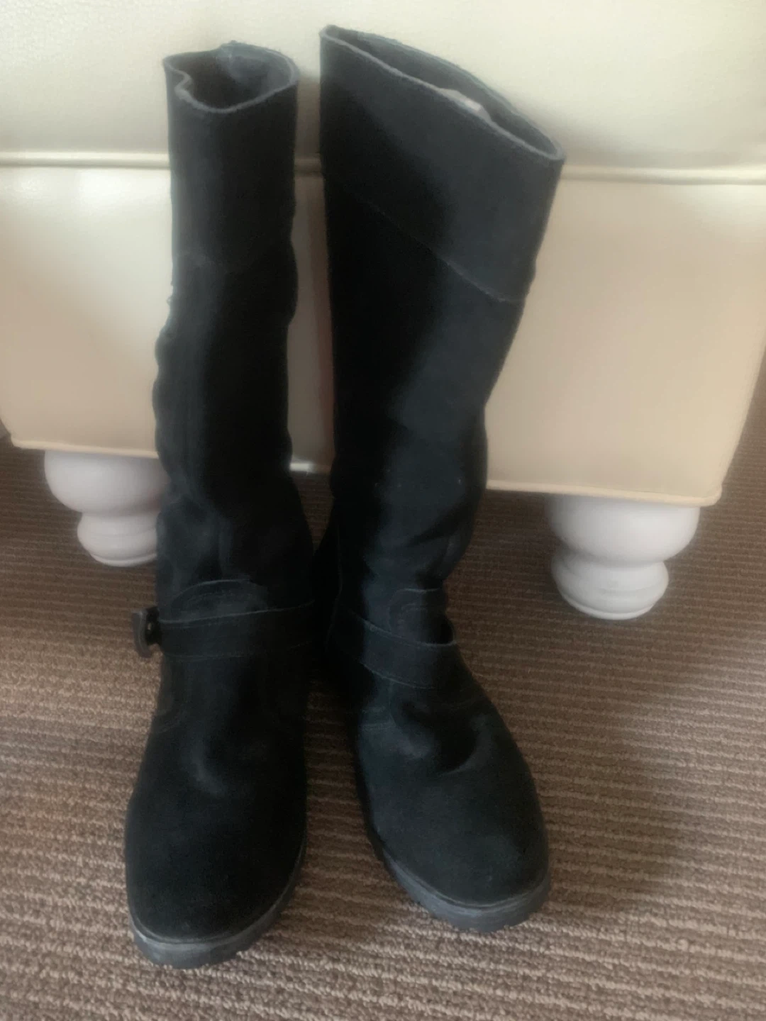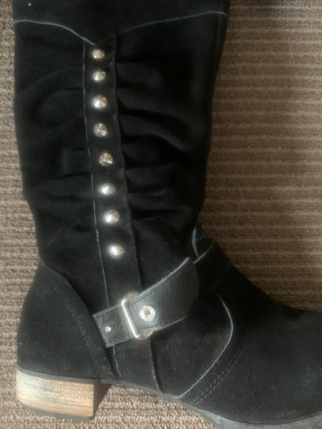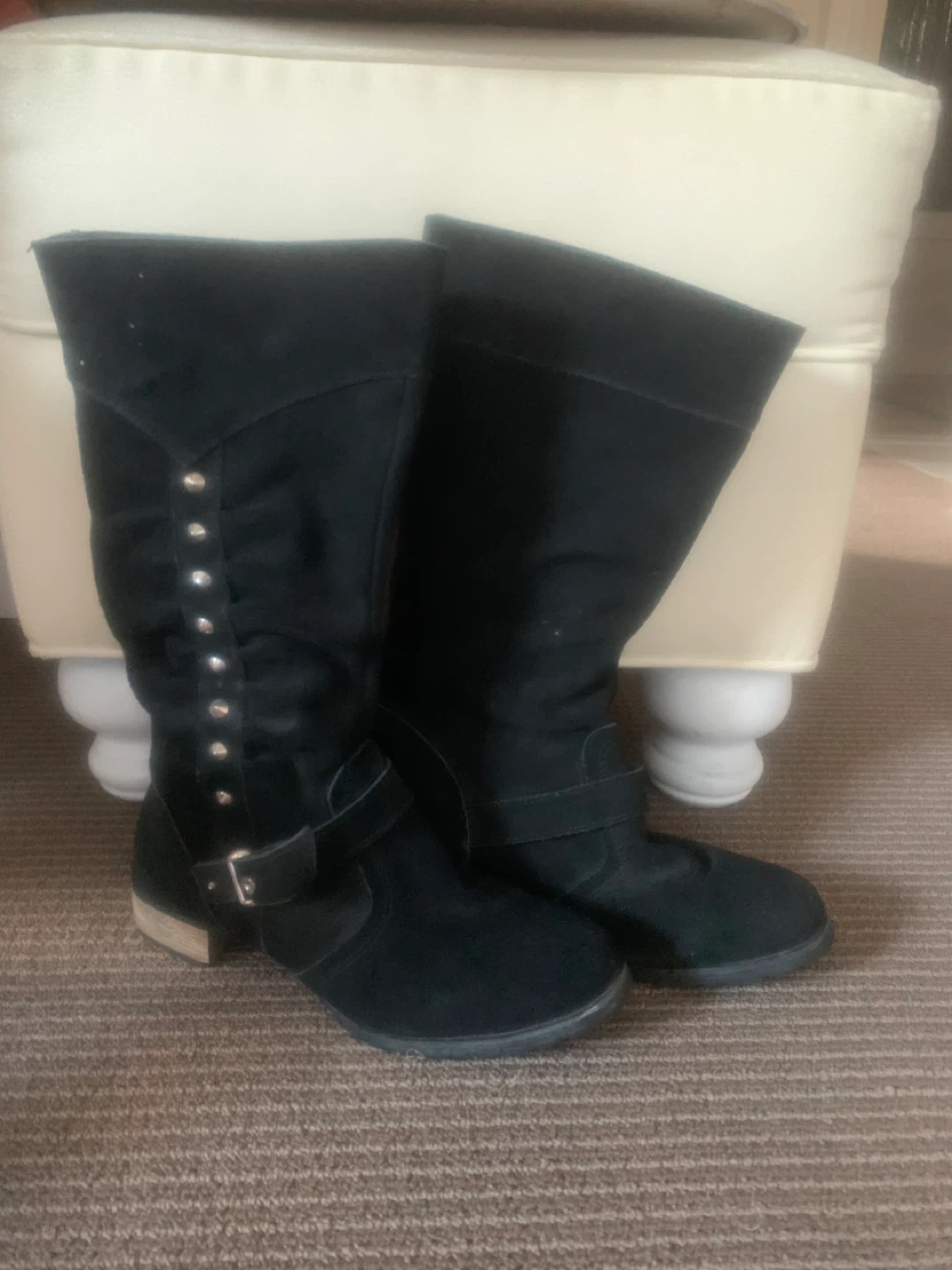 Selling a pair of new black suede knee-high boots. They are a size 36 (5) and feature a buckle detail and silver studs on the side. Great for fall! Pick up at Eglinton Ave east at Bayview.