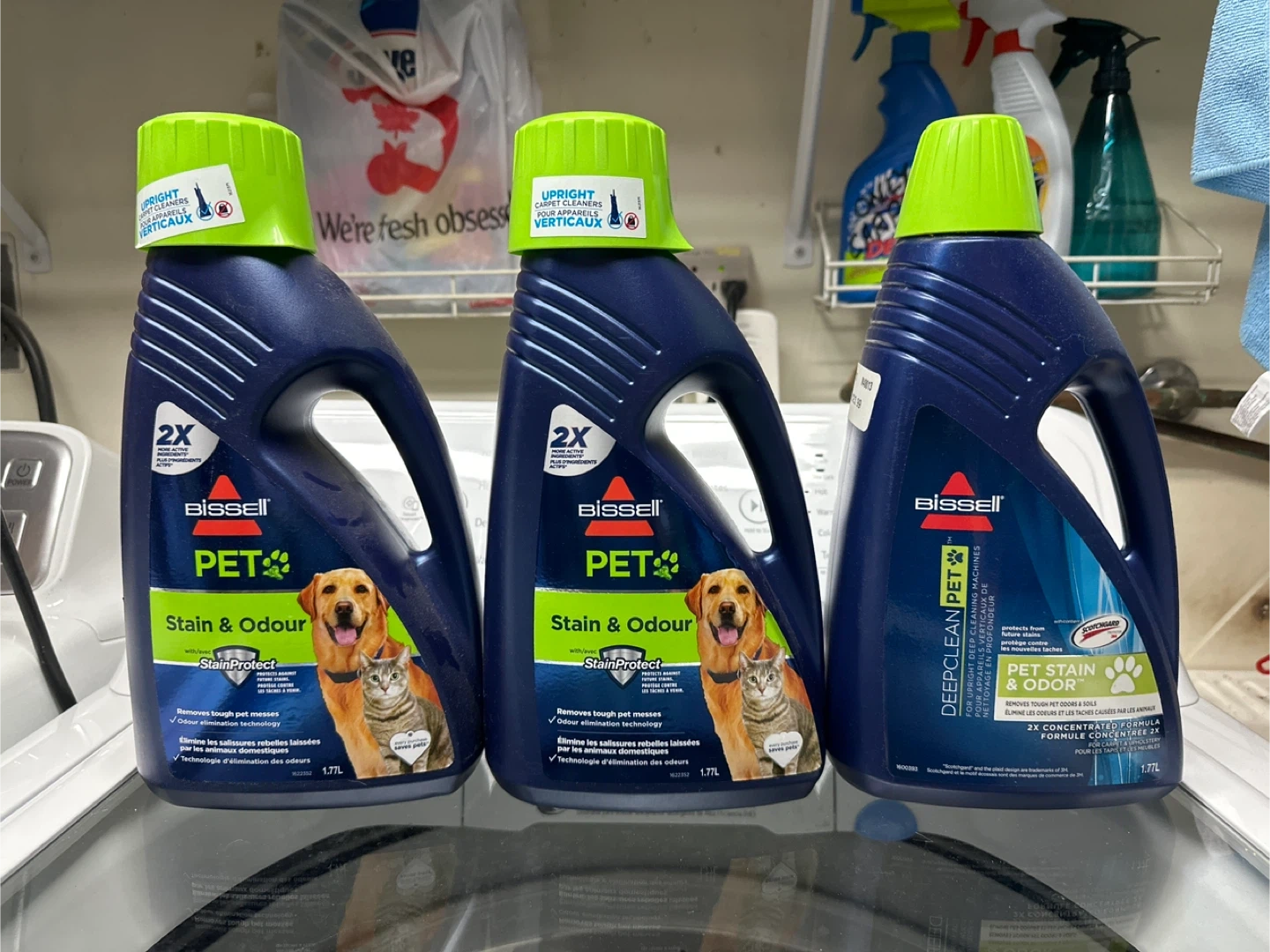 I have a 2 NEW and one half bottles of Bissell Deep Clean Pet Stain & Odour carpet cleaner for upright machines! It's a 2X concentrated formula that removes tough pet odours and soils, and also protects from future stains with Scotchgard