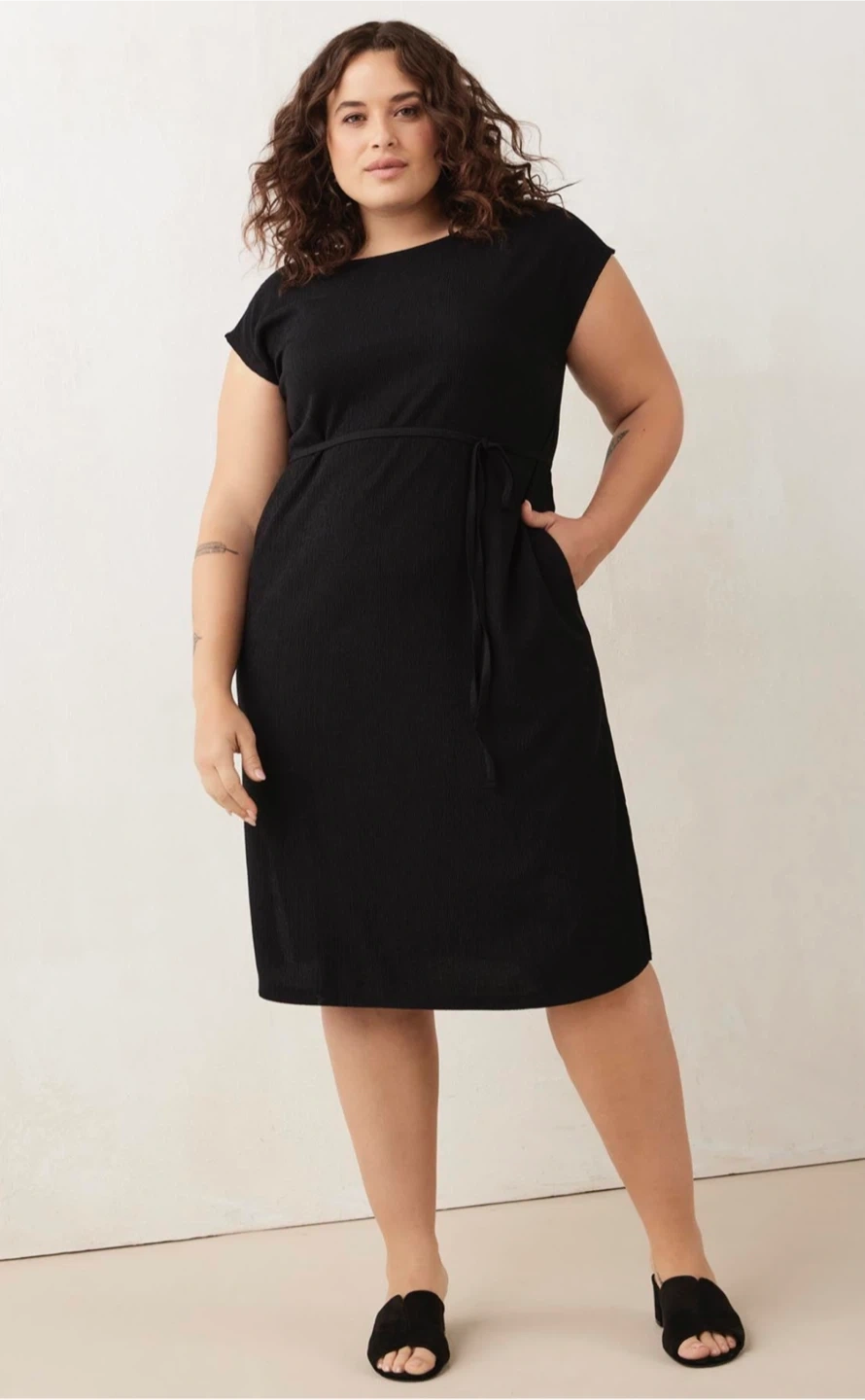 A minimalist dream with thoughtful details: this black cap sleeve dress from Penningtons features a relaxed, comfortable silhouette with subtle texture, an optional waist tie, and convenient side pockets. The side slits add easy movement while keeping the look sleek. Made from a soft, stretchy fabric (98% polyester, 2% elastane) that drapes beautifully without clinging.