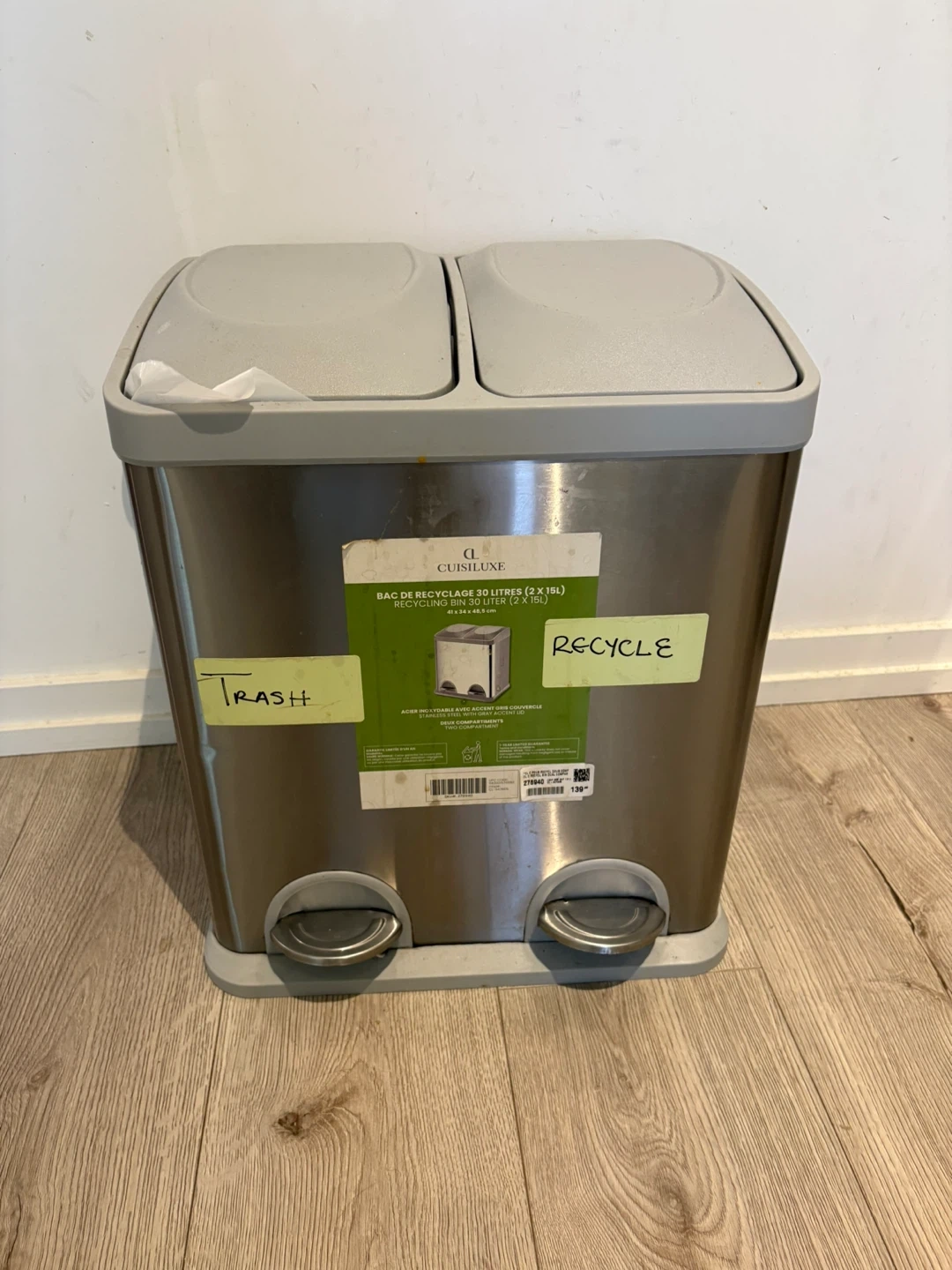 Selling a Cuisiluxe recycling bin with two compartments, each holding 15L, for a total of 30L. It's perfect for separating your trash and recyclables! This bin has a foot pedal for hands-free operation, making it super convenient to use