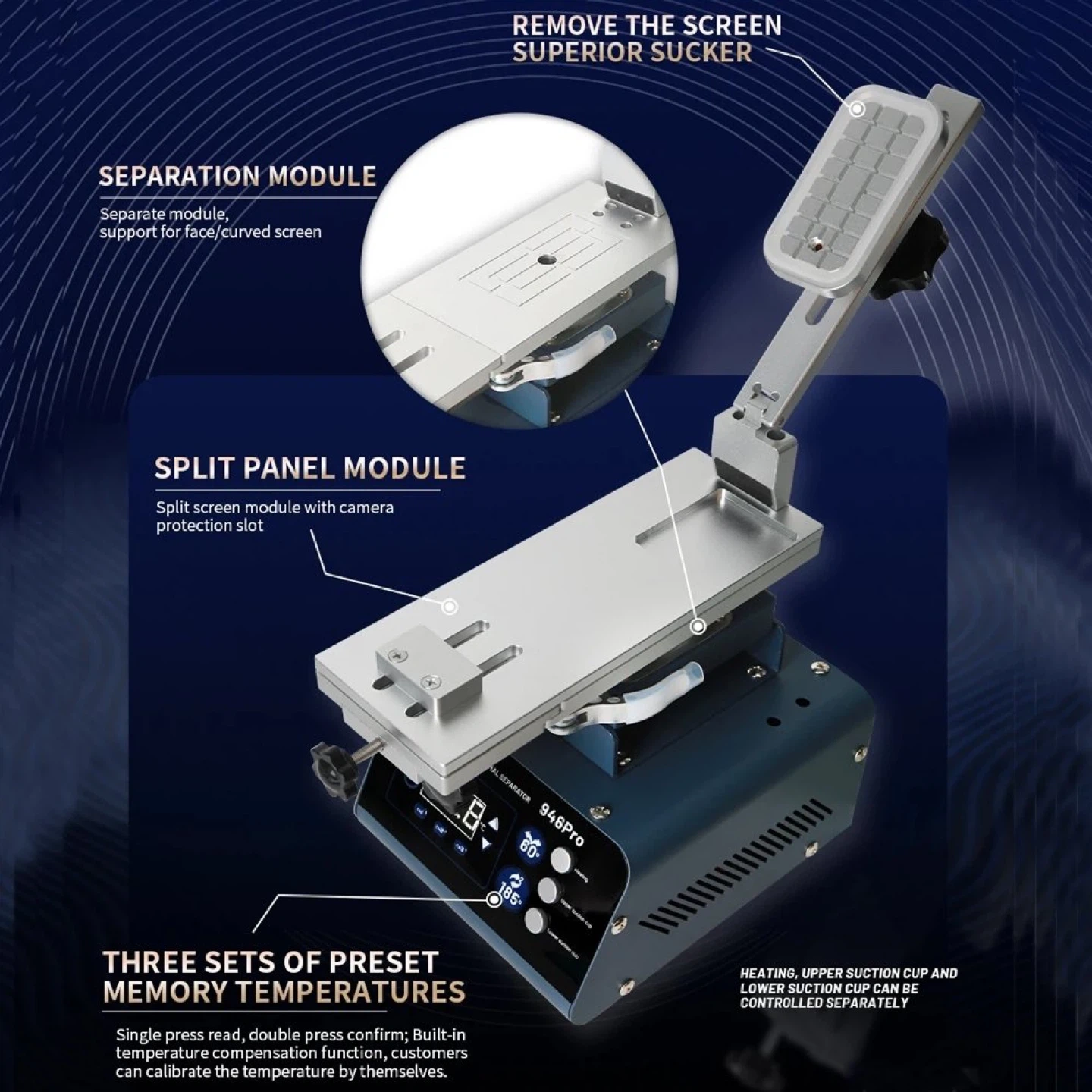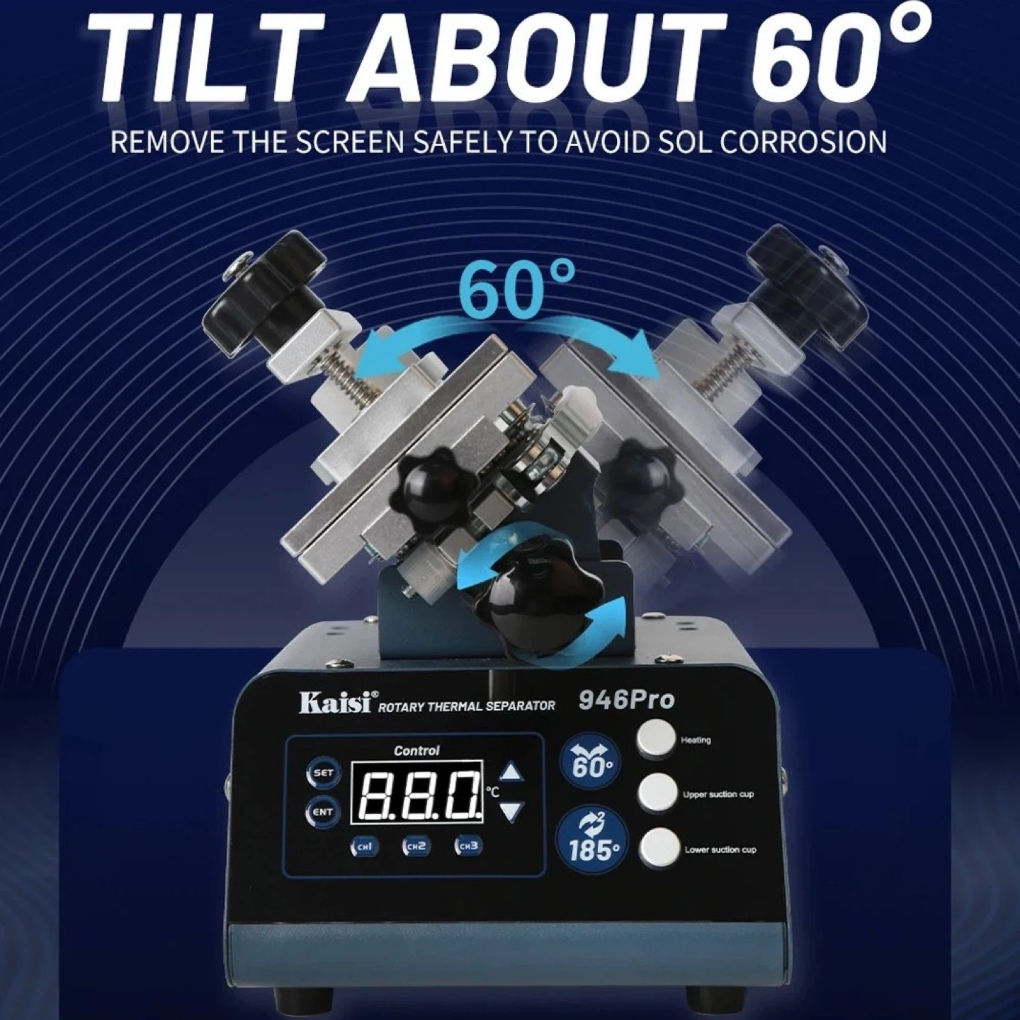Selling a Kaisi 946Pro Rotary Thermal Separator. This tool is designed to safely remove screens, avoiding corrosion. It features a double vacuum pump and a lip seal ring. The separator also has three sets of preset memory temperatures and the ability to tilt about 60 degrees