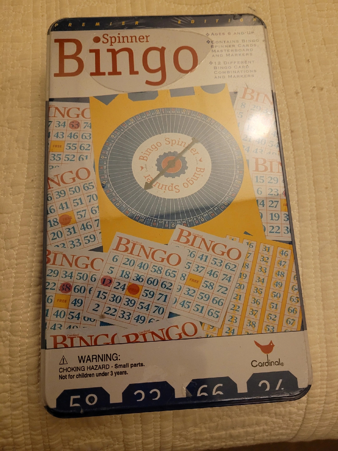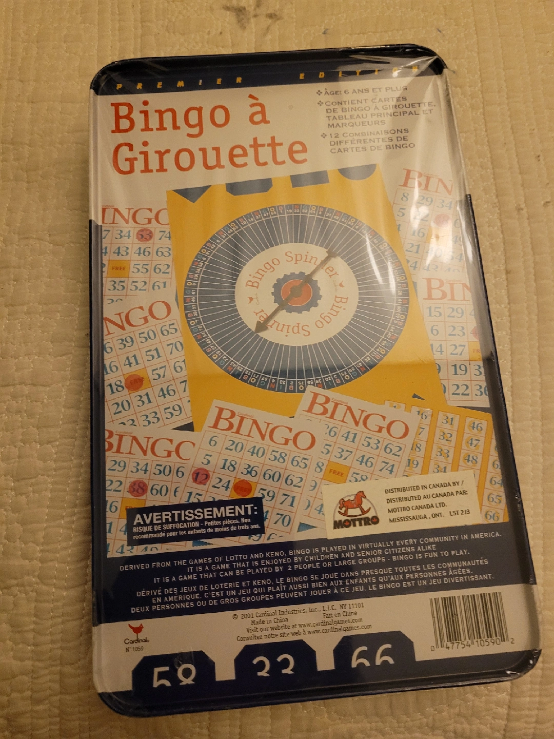 61Selling a new, sealed Cardinal Spinner Bingo à Girouette Premier Edition game! It contains bingo cards, markers, and a masterboard. Great for ages 6 and up! Perfect for family game night or a fun activity with friends