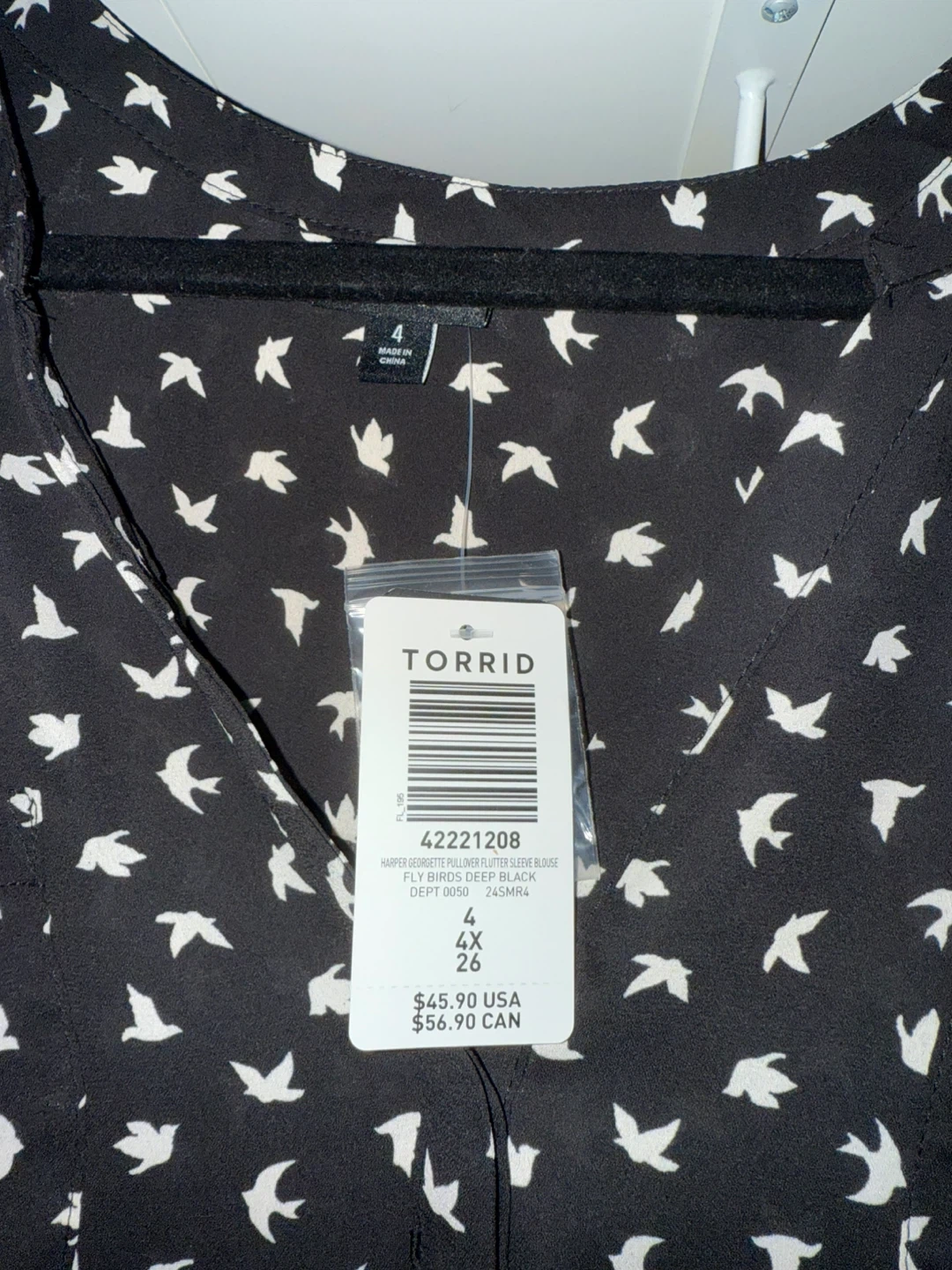 Lightweight and flowy, this Torrid Harper pullover blouse features a flattering V-neck, chest pockets, and flutter sleeves. The playful black-and-white bird print adds a fun touch while staying office- or brunch-appropriate. • Size: 4X (fits approx. size 26) • Style: Harper Georgette Pullover Flutter Sleeve Blouse • Print: Fly Birds on Deep Black • Material: Lightweight woven georgette (semi-sheer, no stretch) • Condition: New with tags – never worn • Original Price: $56.90 CAD Pairs well with jeans, dress pants, or tucked into a skirt! 📍 Pickup near Dufferin & Wilson (Yorkdale area)