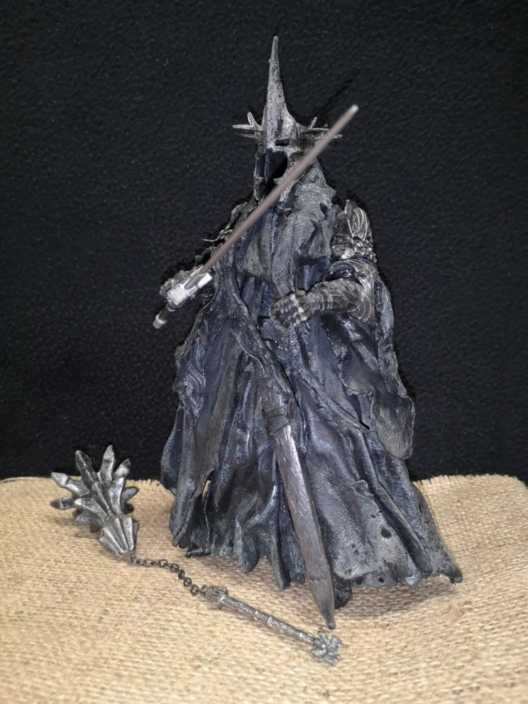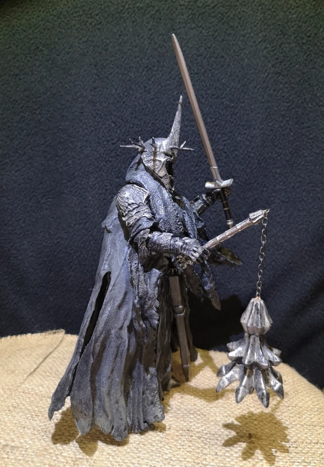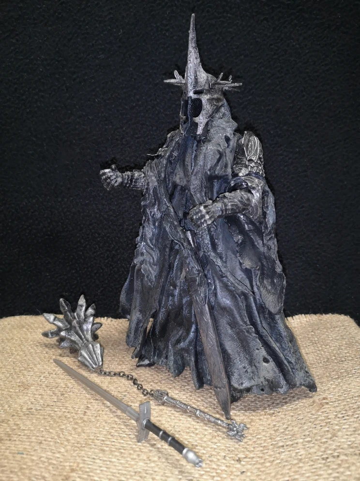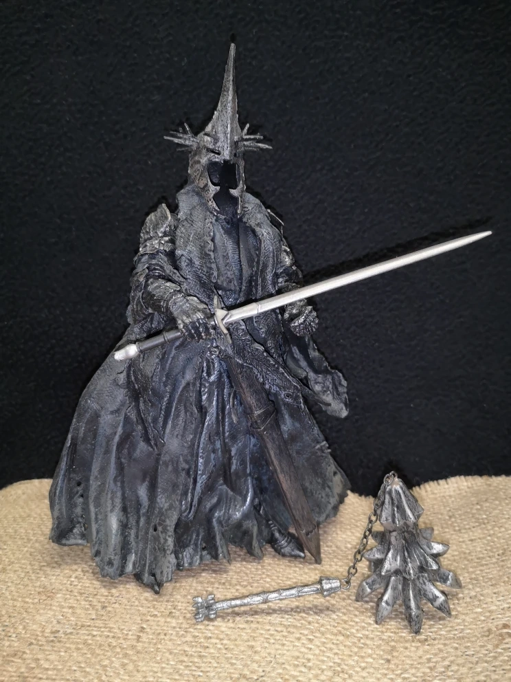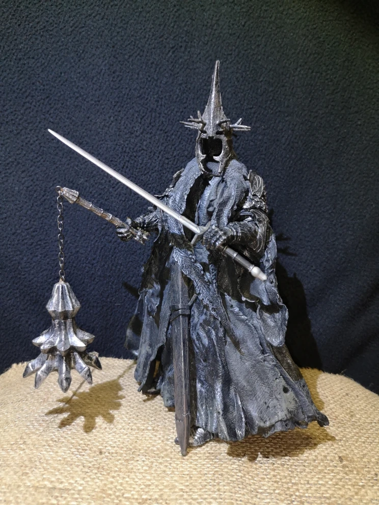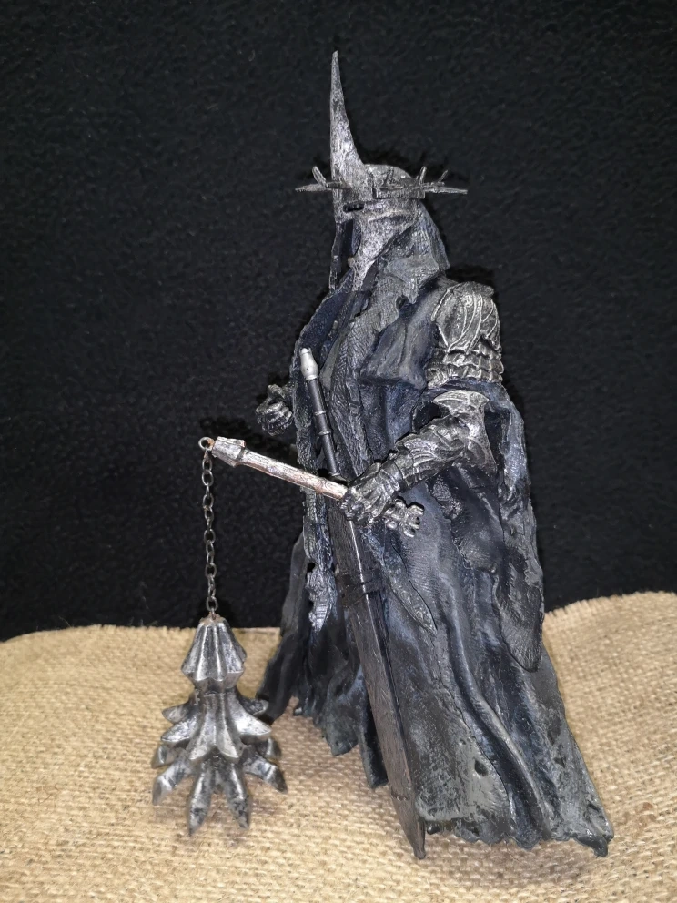 Lord of the Rings Return of the King Morgul Lord Witch King of Angmar Greatest of the dark servants of Sauron, known to men as the Ringwraiths or Nazgul, the Witch King is his Master's lieutenant in the field and dwells in the cursed fortress of Minas Morgul. When the Dark Lord sends his armies against the free realm of Gondor, the Witch King falls above them as their chief. The terror he commands and exerts upon the hearts of men is the Witch King's greatest weapon, for it has been prophesied that, by the hand of no mortal man, can he be slain. Few can withstand his overwhelming presence in battle. From 2003 Produced by Marvel Inc. Manufactured by Toy-Biz. Complete and in fantastic shape. There is a button between his shoulder blades to work the mechanism to swing his right arm. - Straight sword. - Secure sheath. - 8" tall. - Mace flail. - Metal chain. - Working swing mechanism. - Molded durable rubber + plastic. - No warping. - No box. Pickup in Ranchlands in NW Calgary. Shipping is an option if you desire.