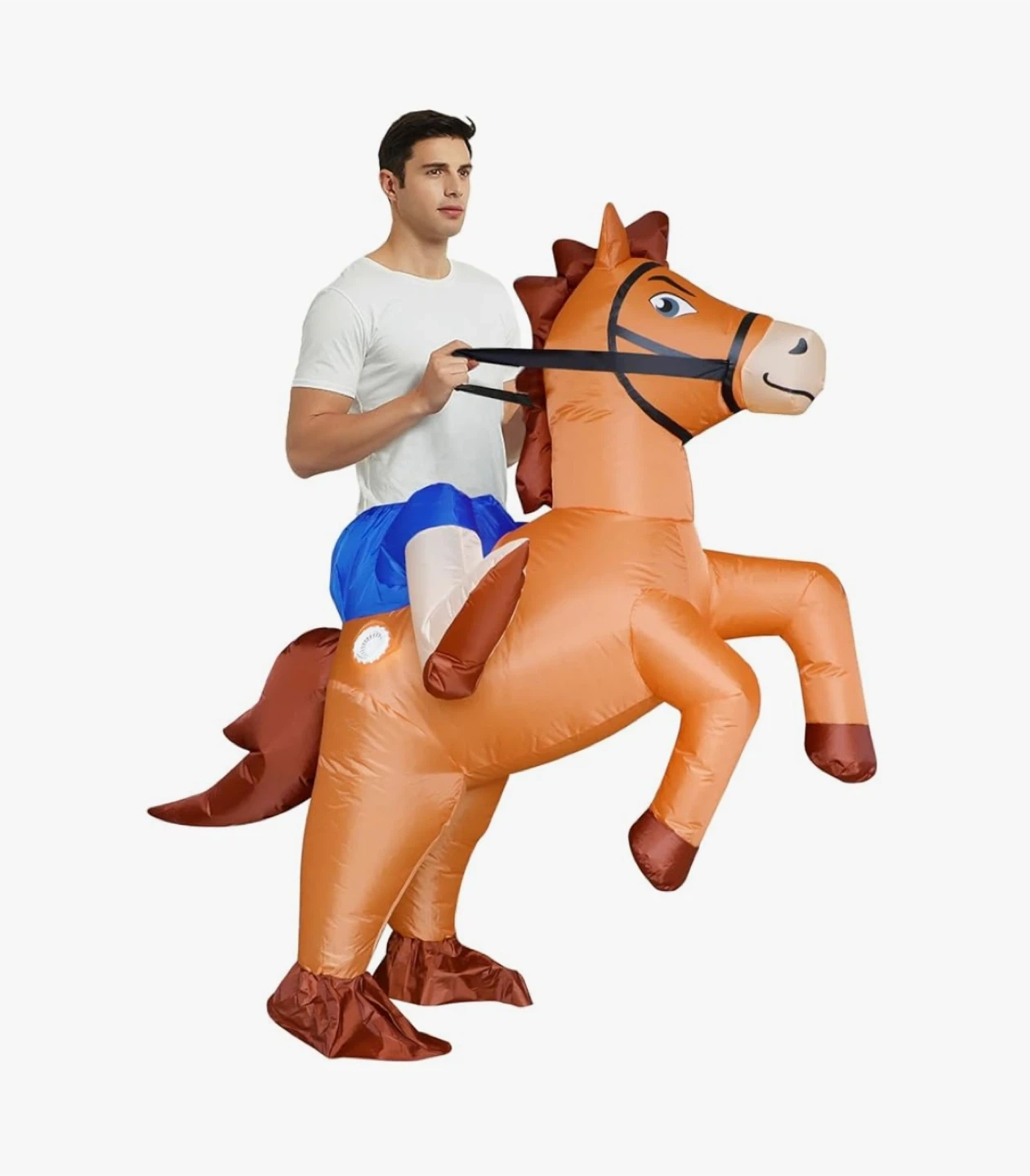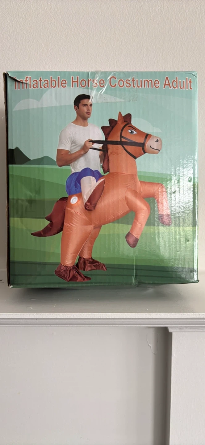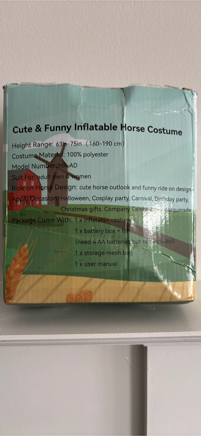 Get ready to giddy-up with this hilarious inflatable horse costume! It's the perfect way to add some fun to Halloween, cosplay parties, carnivals, or birthday celebrations. The costume is made of 100% polyester and fits adults. The height range is 63in-75in (160-190 cm). The package includes the inflatable costume, a battery box and fan (batteries not included),