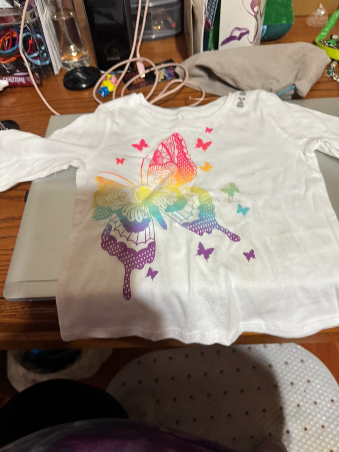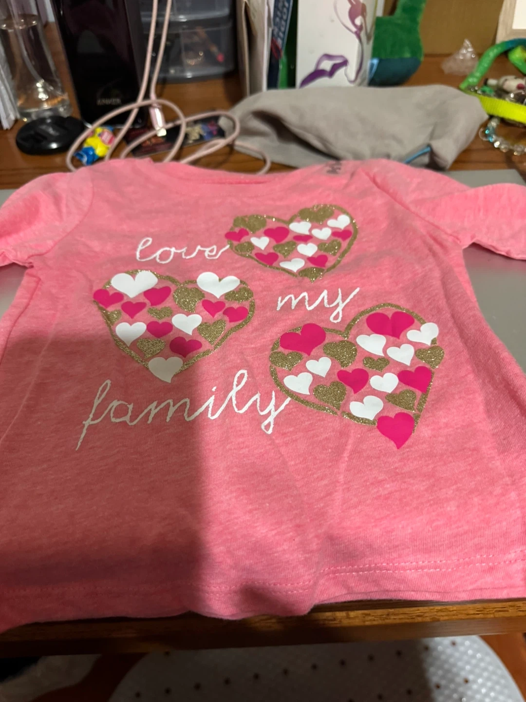 Two cute shirts for a little girl, size 2T! One is white with a colourful butterfly design, and the other is pink with a 'love my family' heart design
