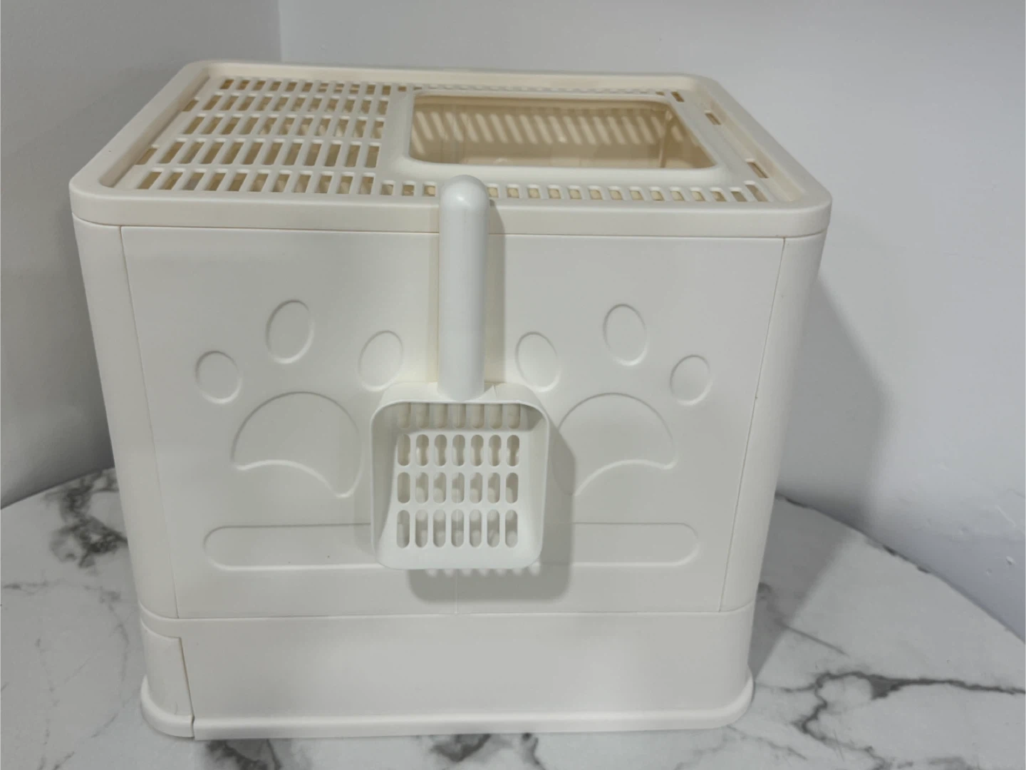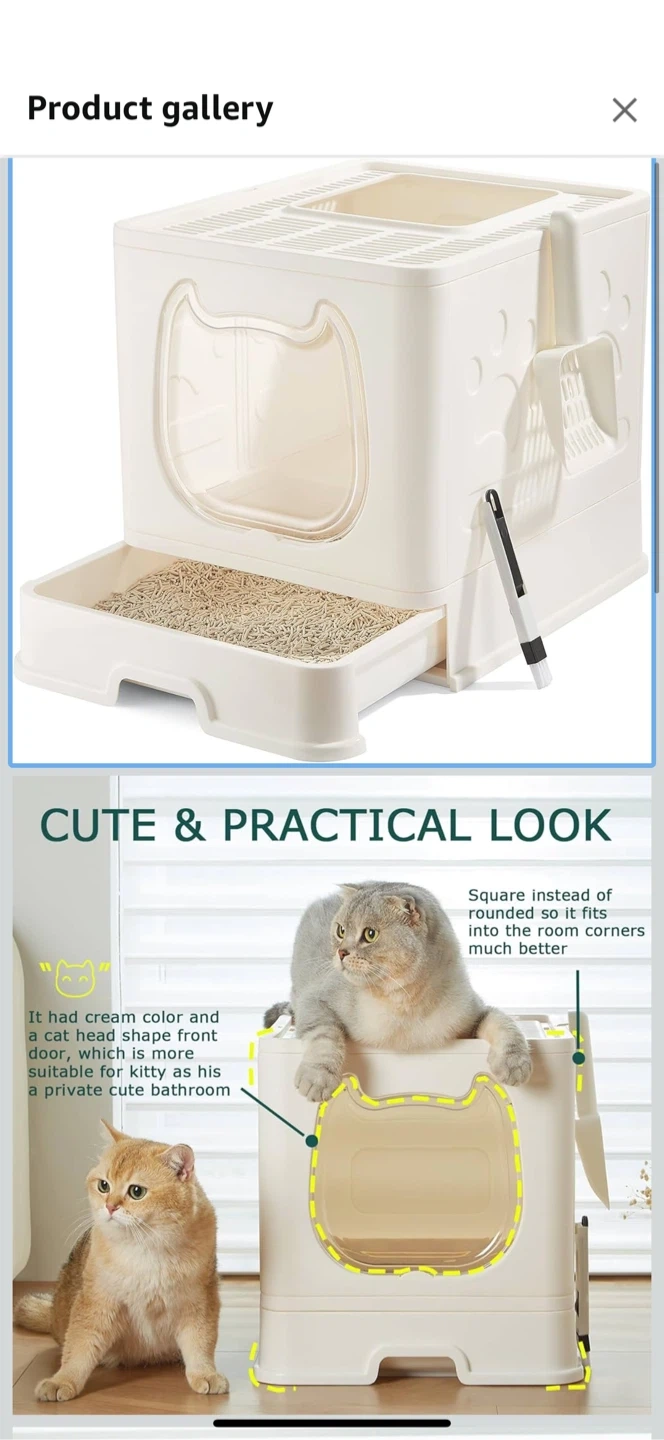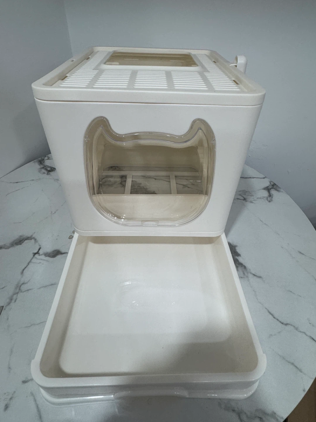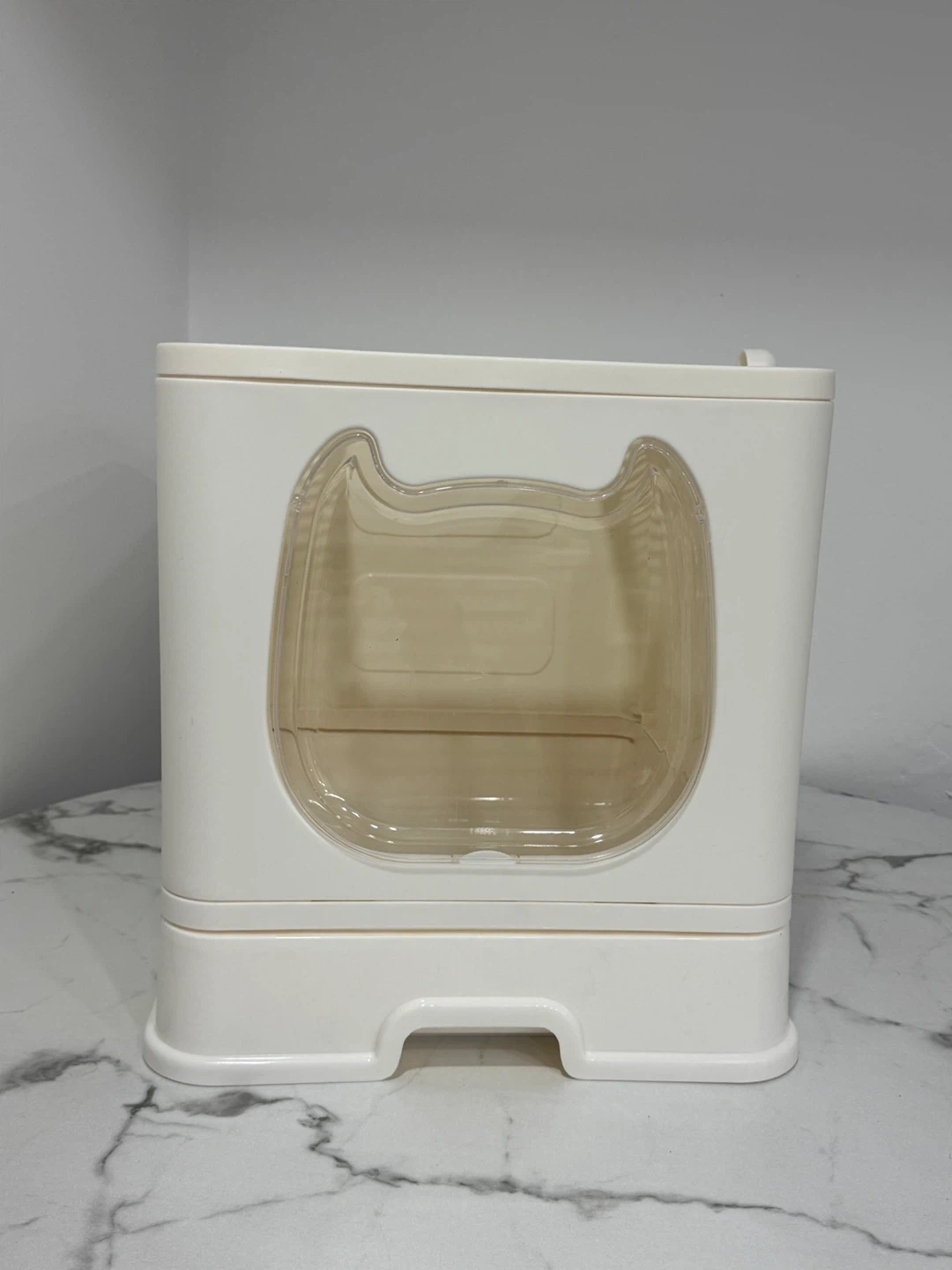 This litter box has a cute cat head shape front door, which is more suitable for kitty as his a private cute bathroom! It's designed to fit into room corners much better. Comes with a scoop.