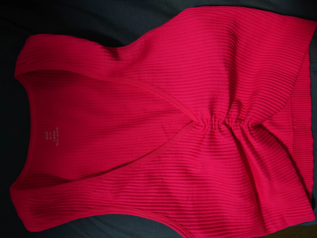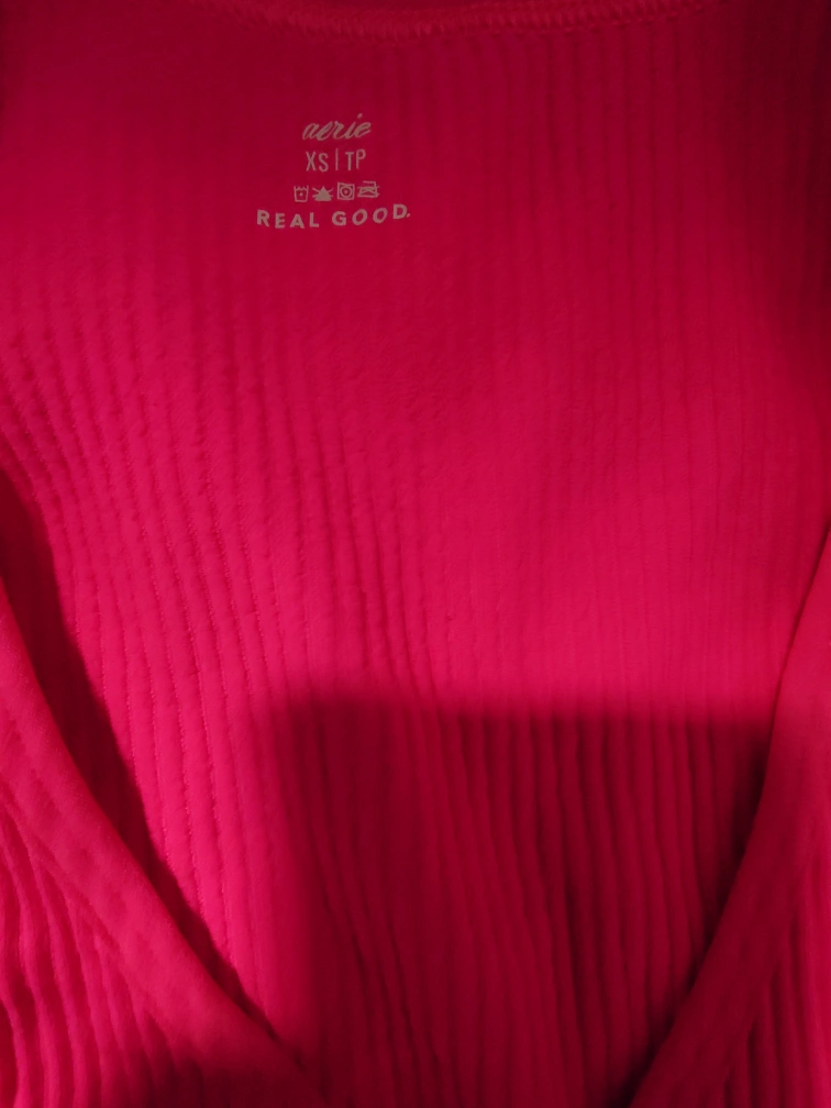 60Selling a cute Aerie wrap top in size XS. It's a vibrant pink colour with a ribbed texture and part of the 'Real Good' collection!