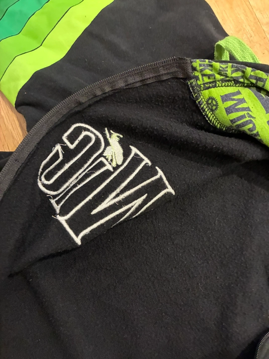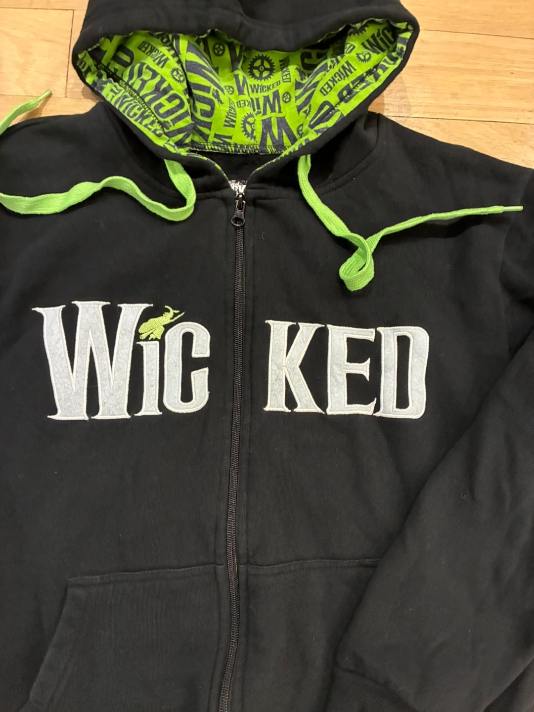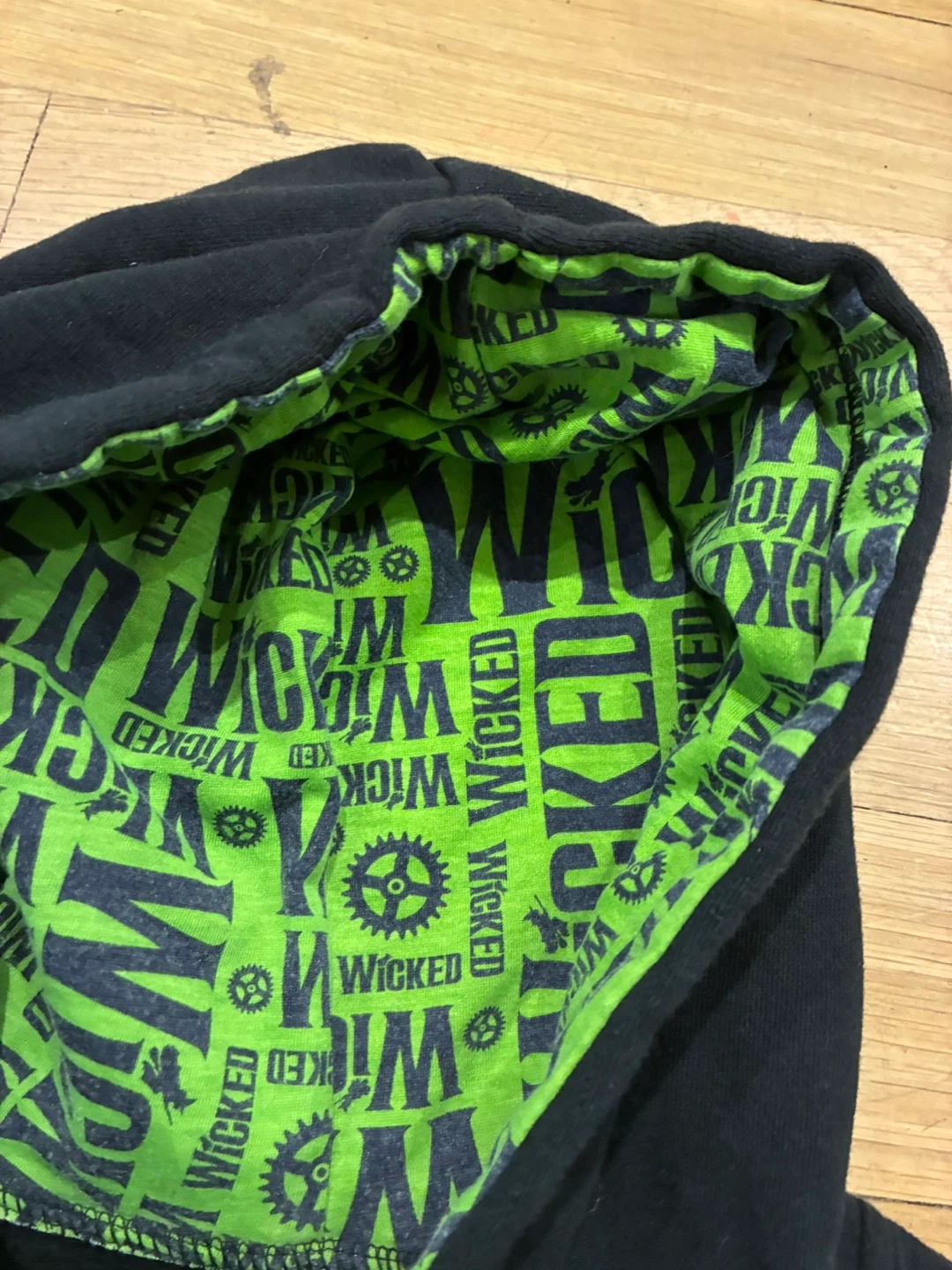 257Selling a Wicked brand full zip hoodie in black! It features a green and black design inside the hood and on the sleeve.