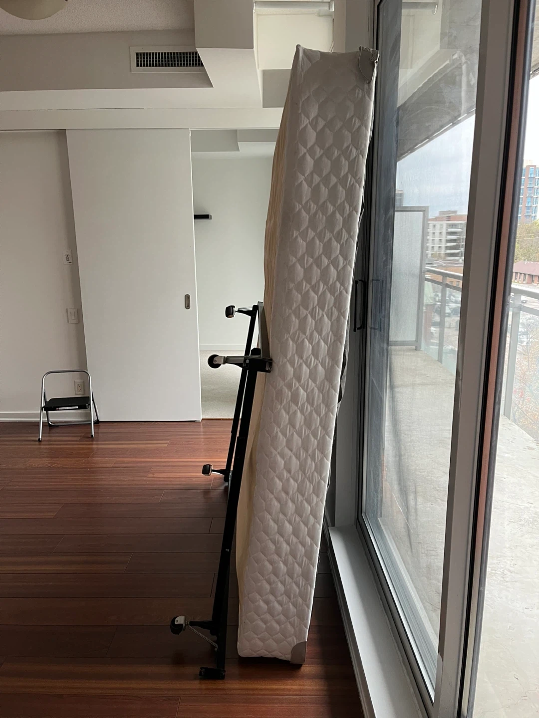 Selling a queen bed headboard and bed frame. It's in great condition and ready for a new home. The frame is sturdy with solid wood headboard. Bed is original from Leon’s. Mattress box and mattress not included.