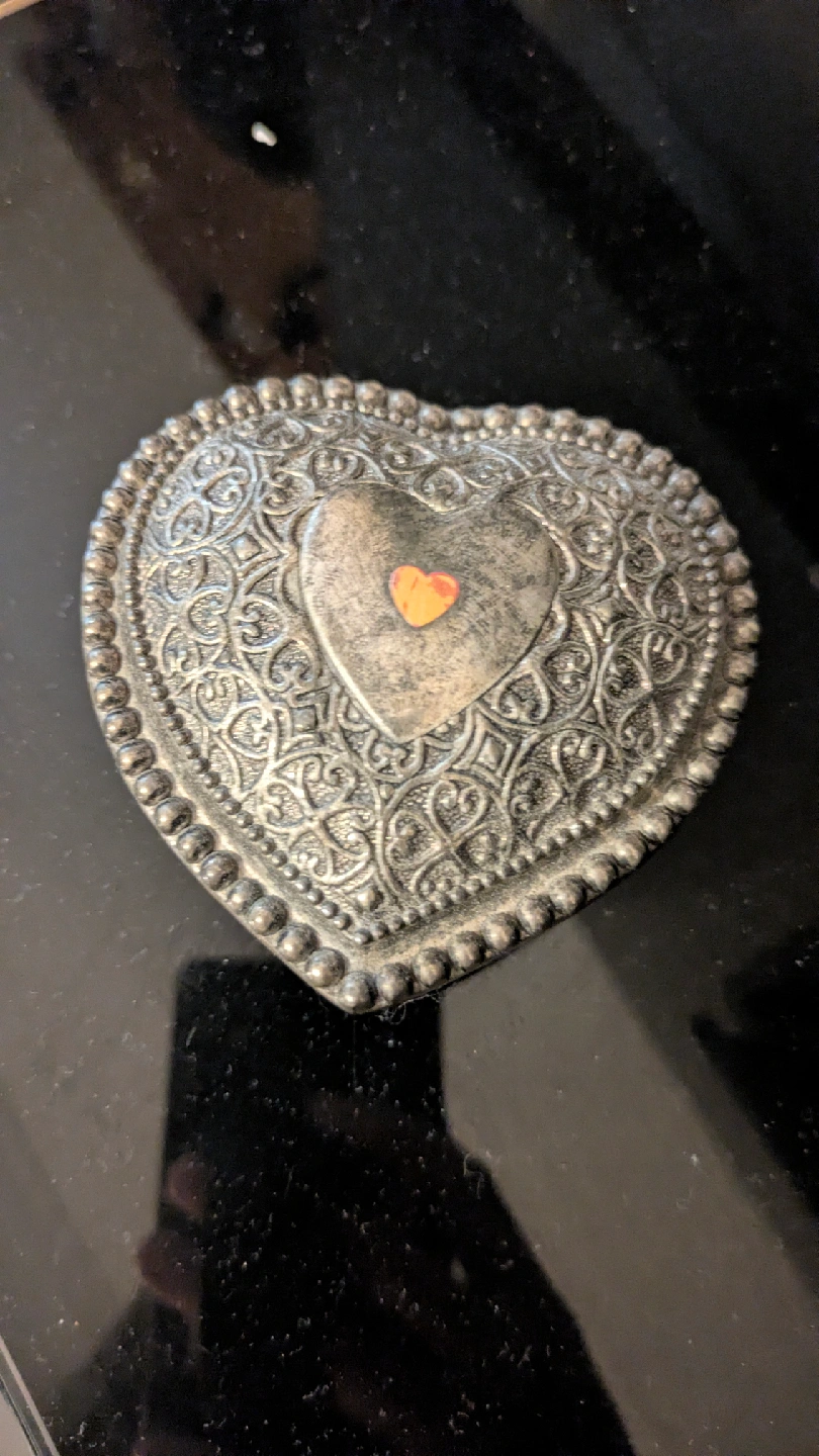 Selling a lovely heart-shaped trinket box. It has a silver plated finish with intricate detailing and a cute little heart on top. The inside is lined with a soft, dark blue fabric. Perfect for holding small jewelry or keepsakes!