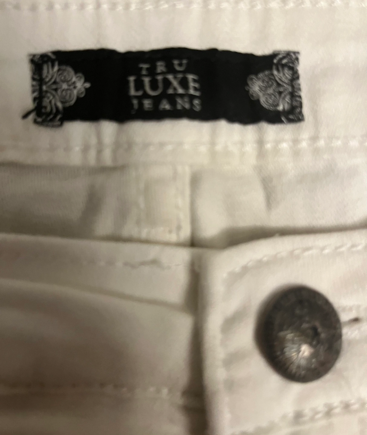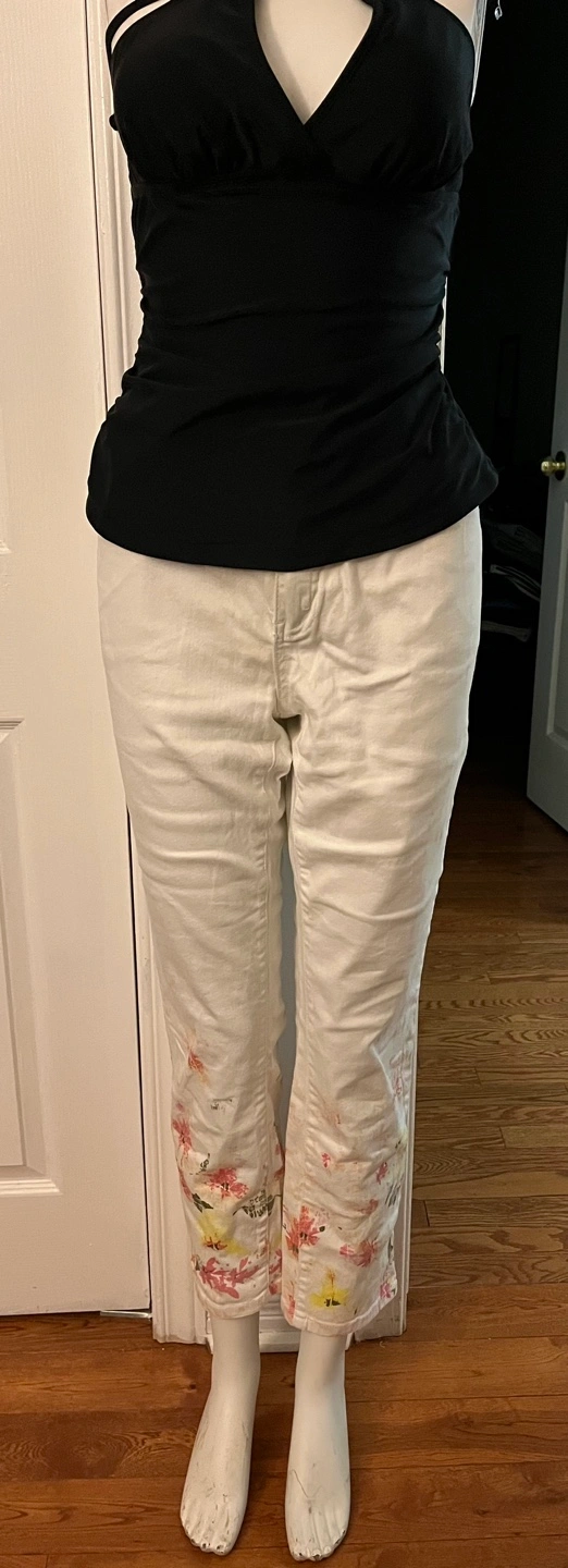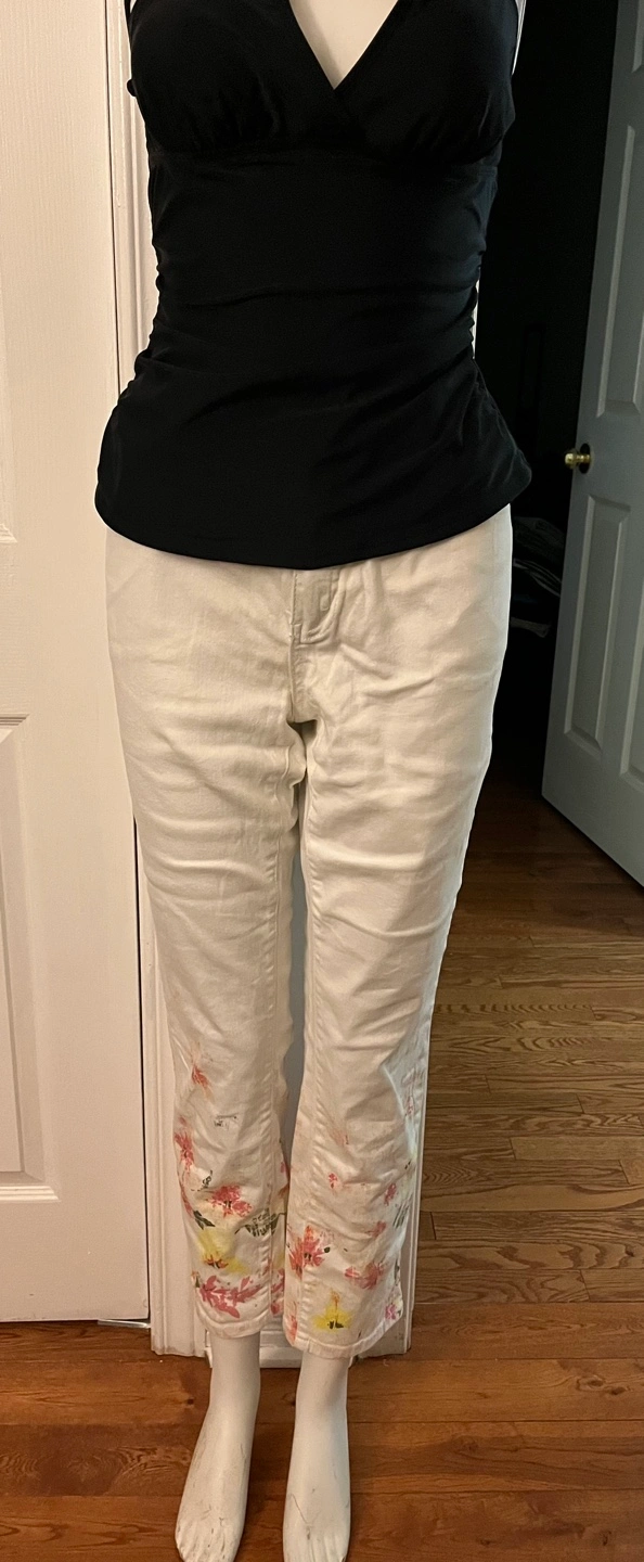 Here are a pair of Tru Luxe jeans! They are a light colour with a unique floral design at the bottom of the legs. Perfect for adding a touch of spring to your wardrobe