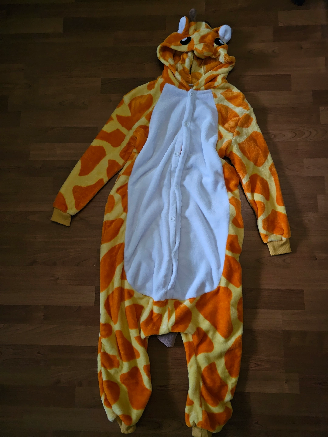Selling a cozy giraffe adult onesie! It's in great condition and perfect for lounging around the house or wearing to a costume party, perfect for Halloween! The onesie has a hood with cute giraffe ears and horns and eyes, and a button-up front. Very plush and warm and cozy! Fits most adults!