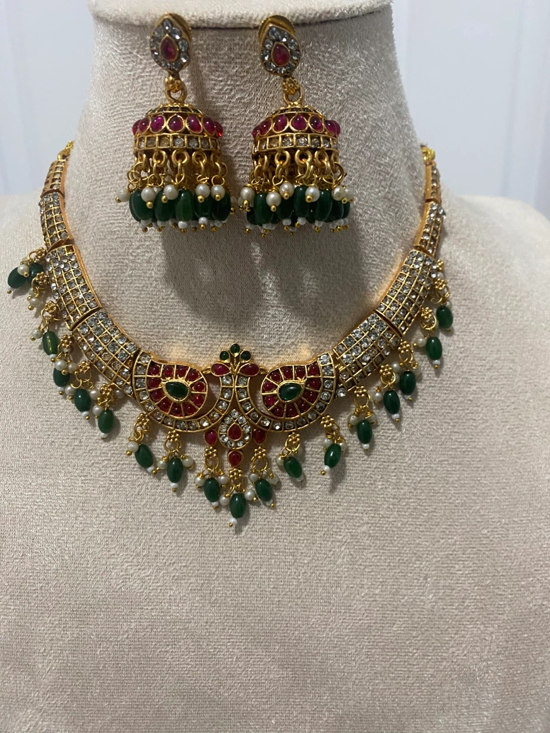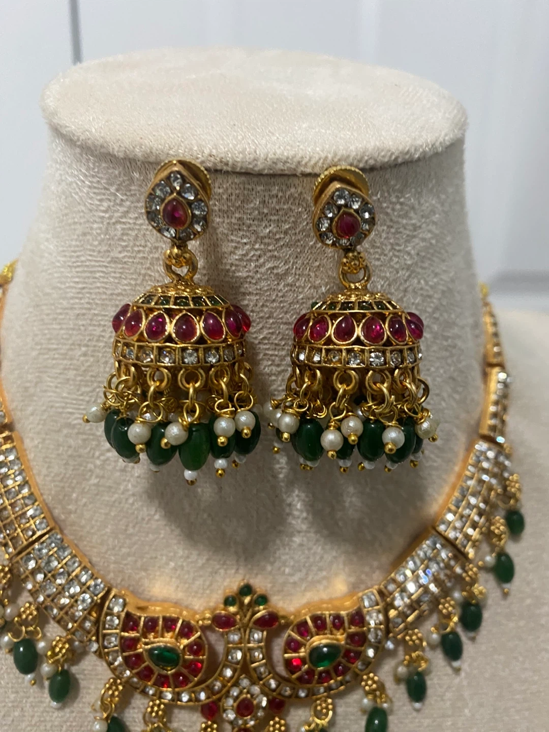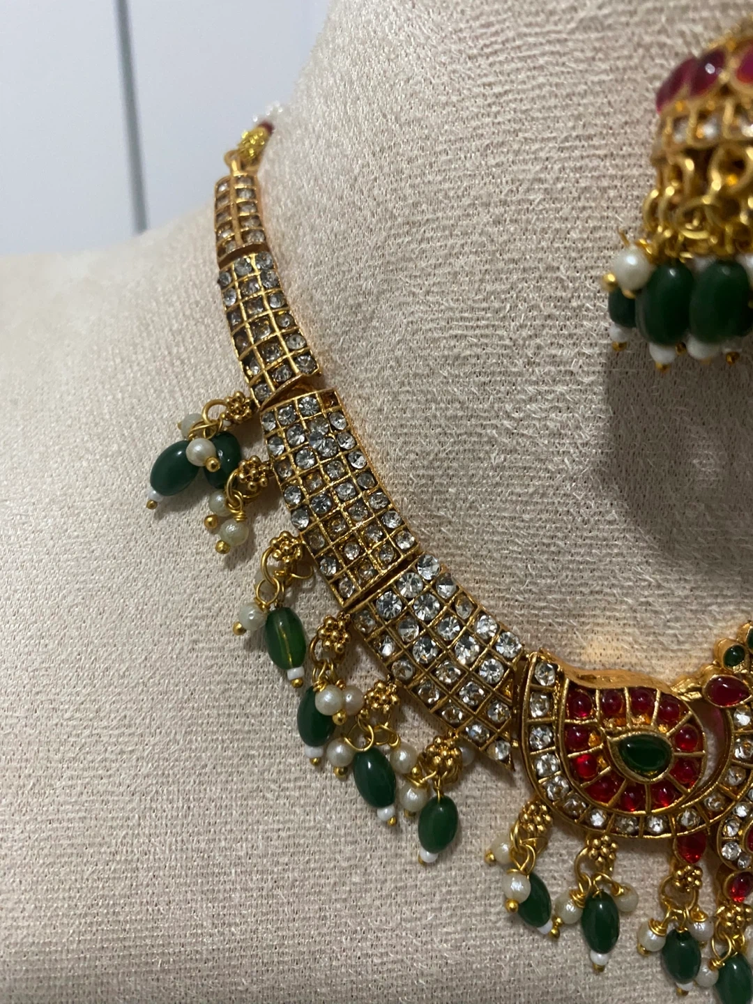 Beautiful necklace and earring set with gold accents, red and green stones, and pearl-like beads. Perfect for adding a touch of elegance to any outfit