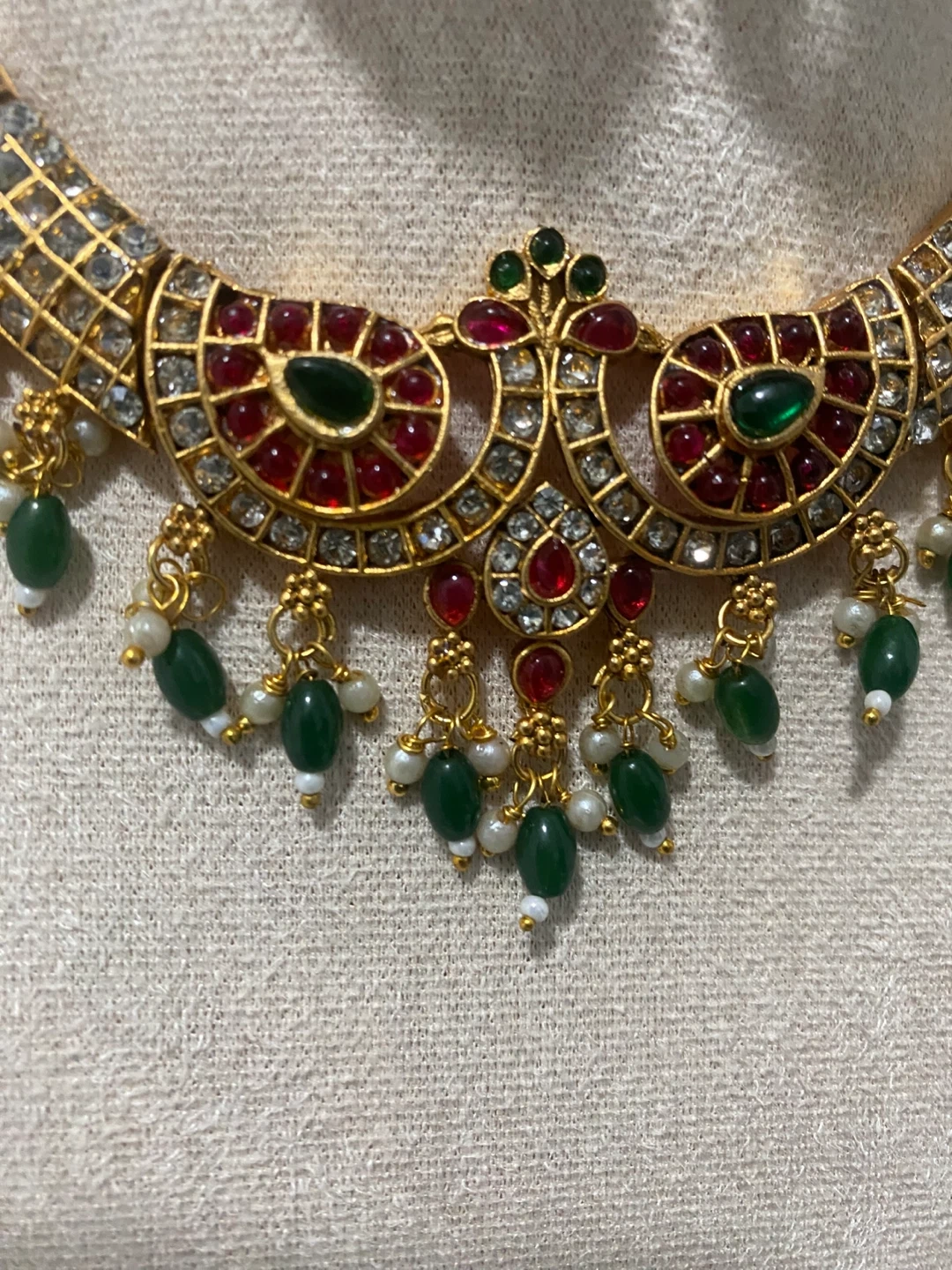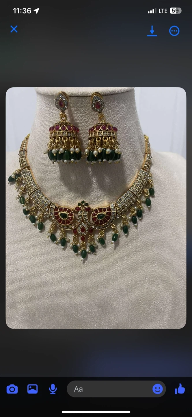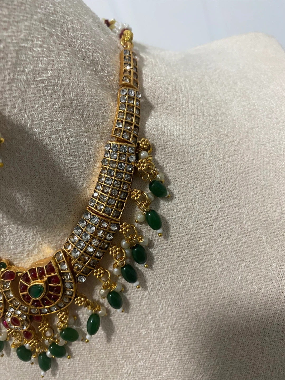 Beautiful necklace and earring set with gold accents, red and green stones, and pearl-like beads. Perfect for adding a touch of elegance to any outfit
