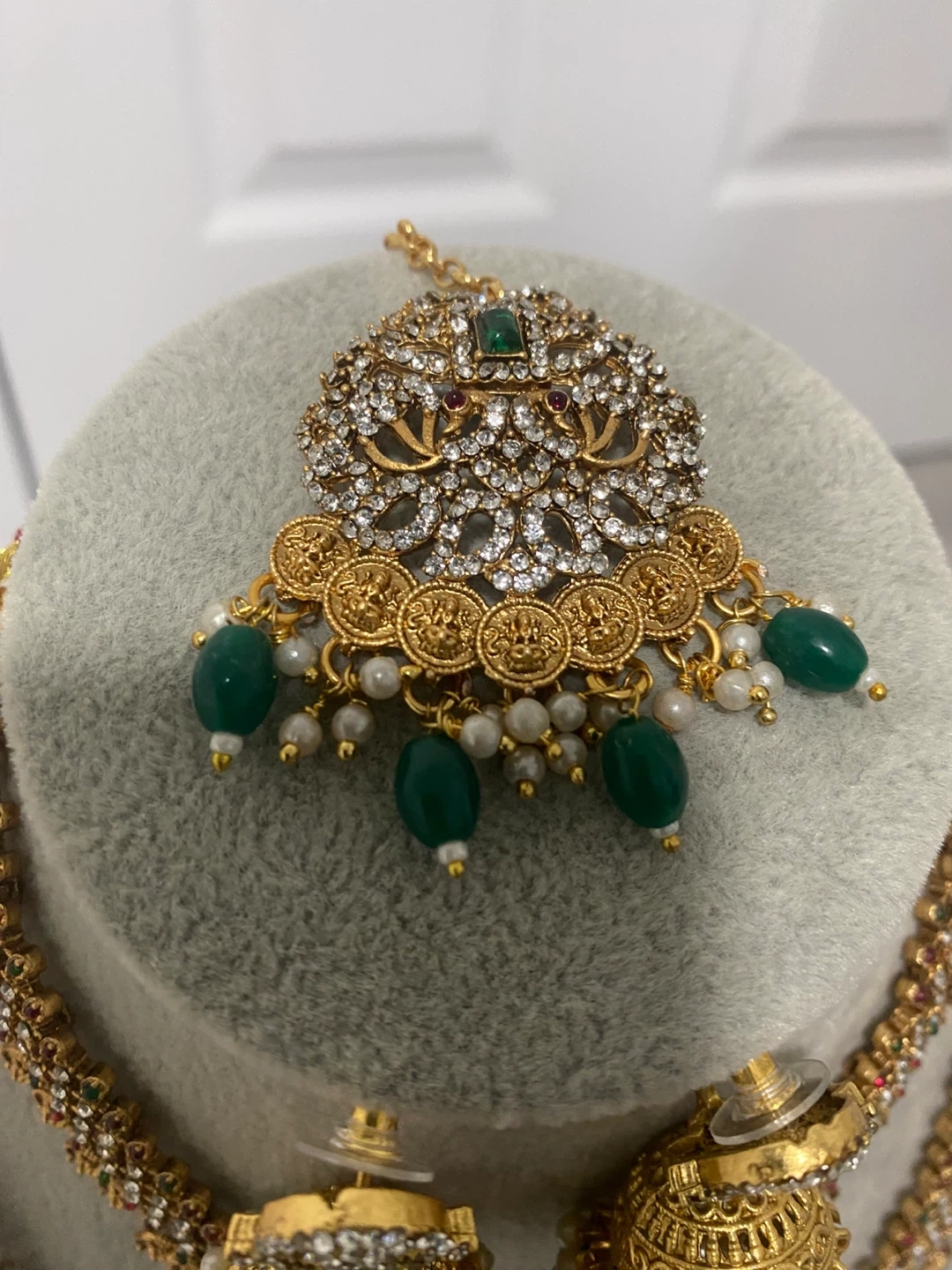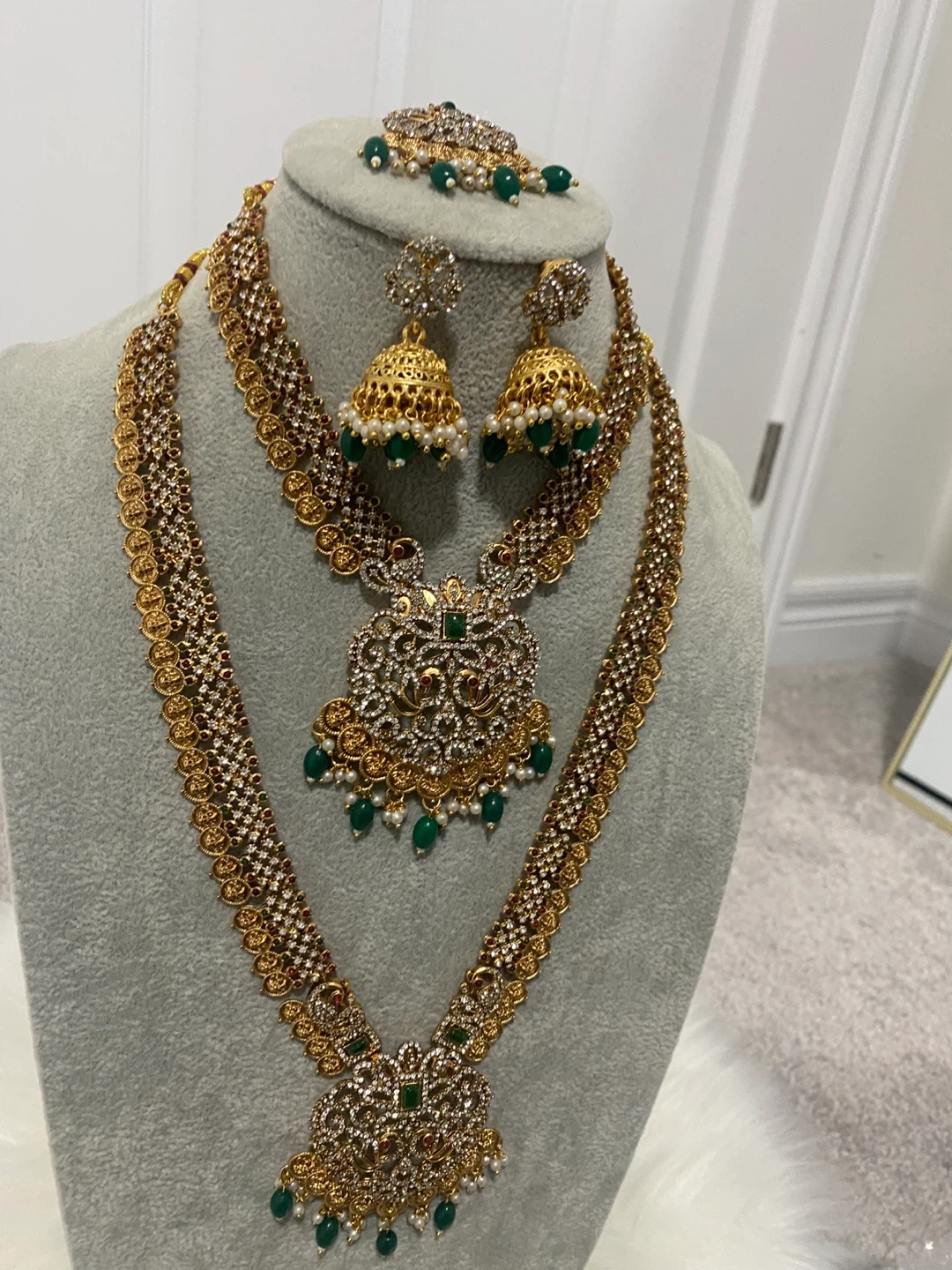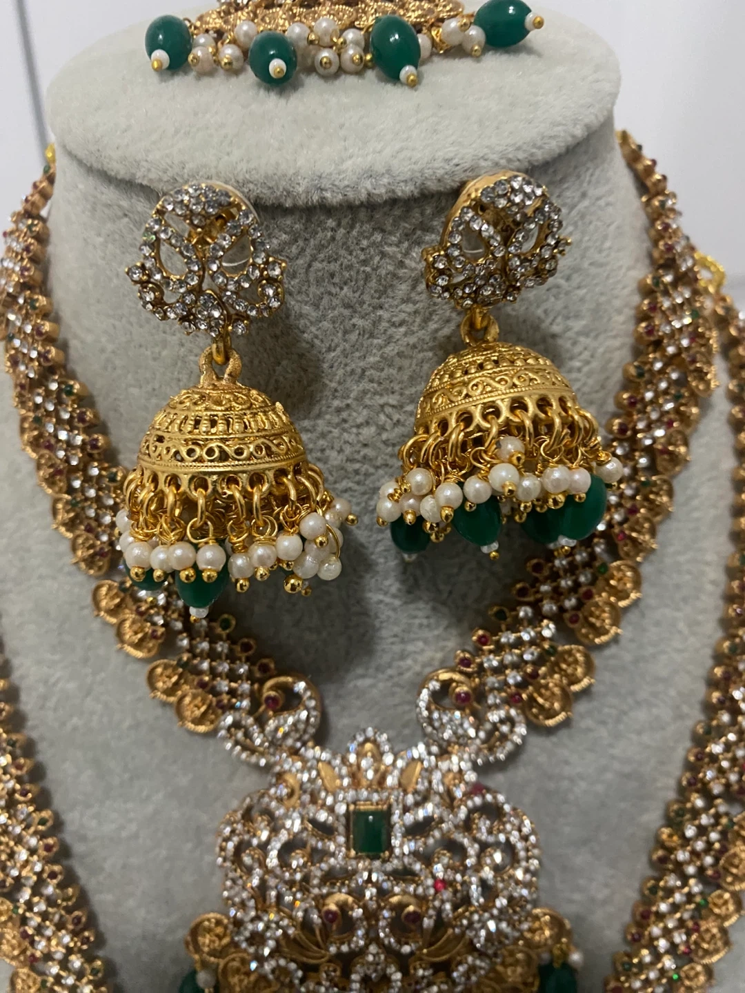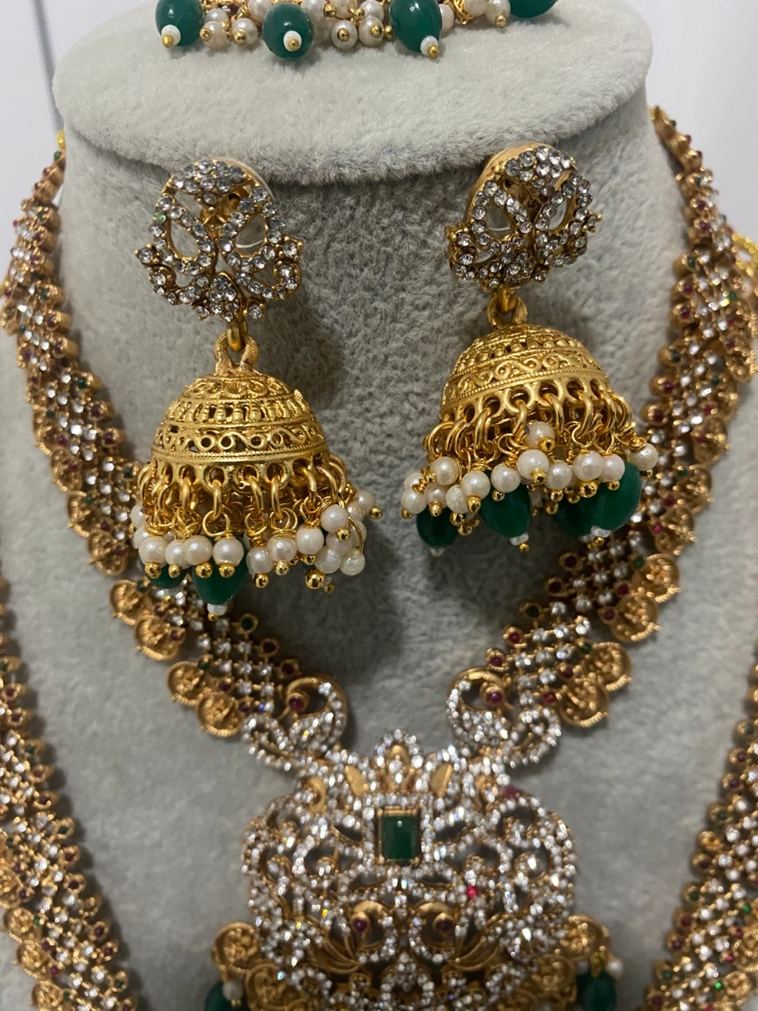 Beautiful gold Indian jewelry set with white and green stones. Includes a necklace, earrings, and headpiece. Perfect for a wedding or special occasion!