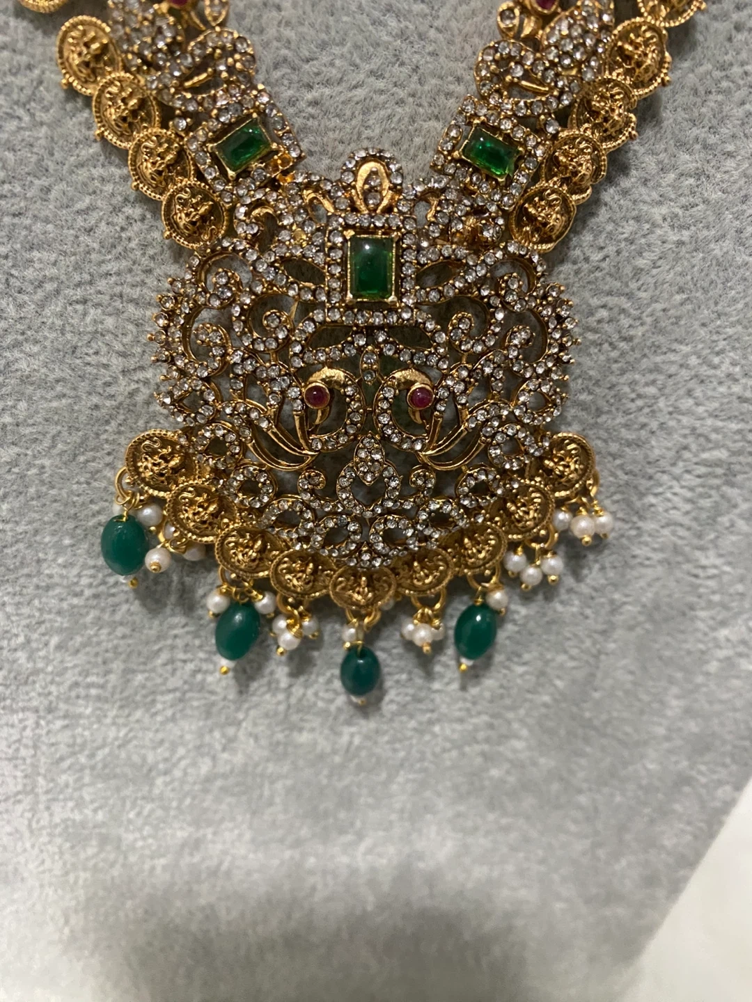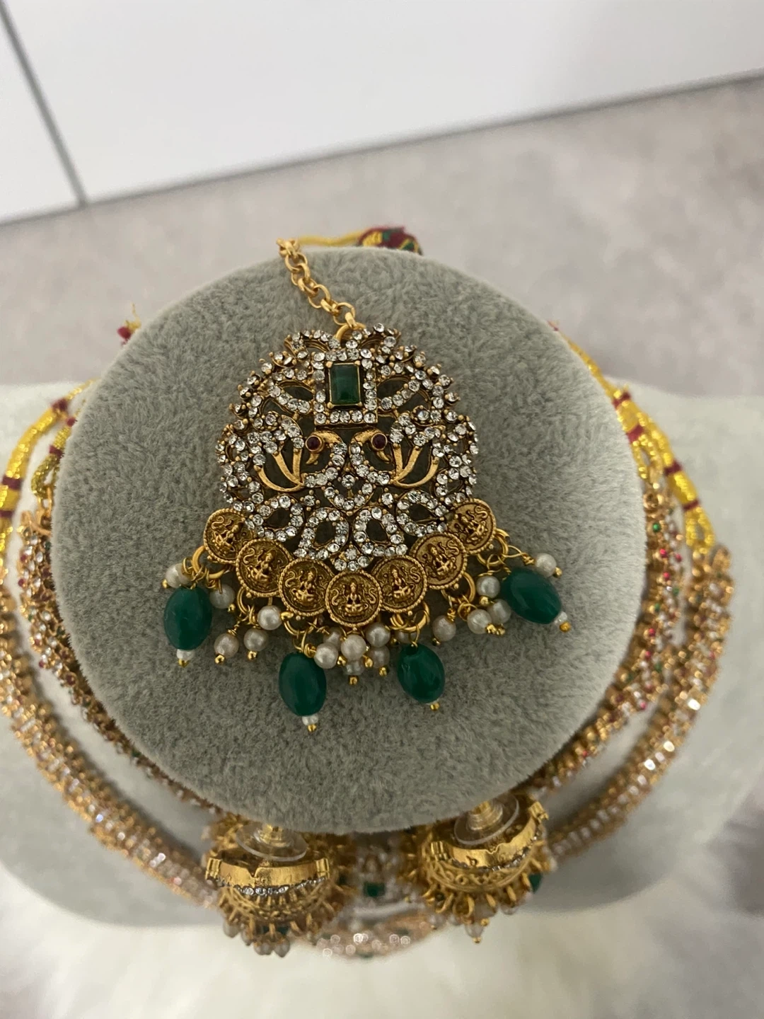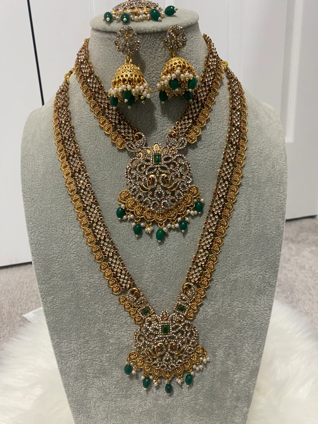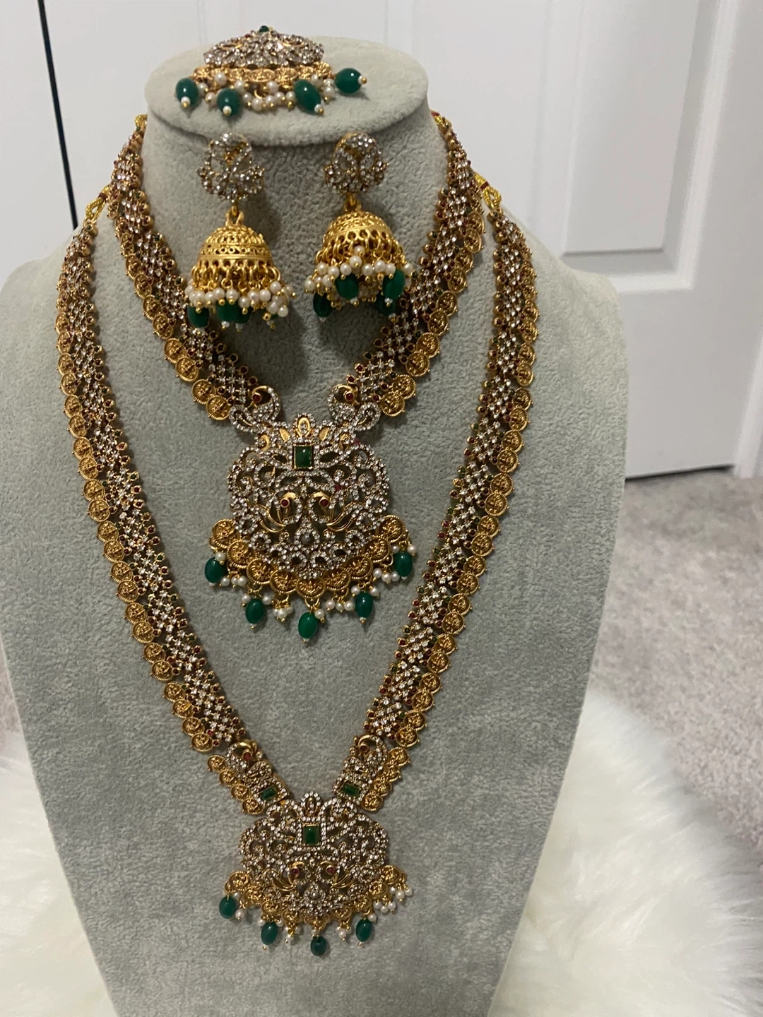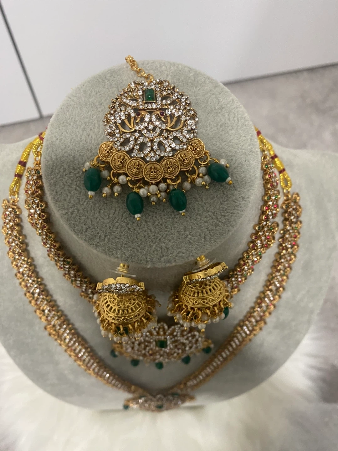 Beautiful gold Indian jewelry set with white and green stones. Includes a necklace, earrings, and headpiece. Perfect for a wedding or special occasion!