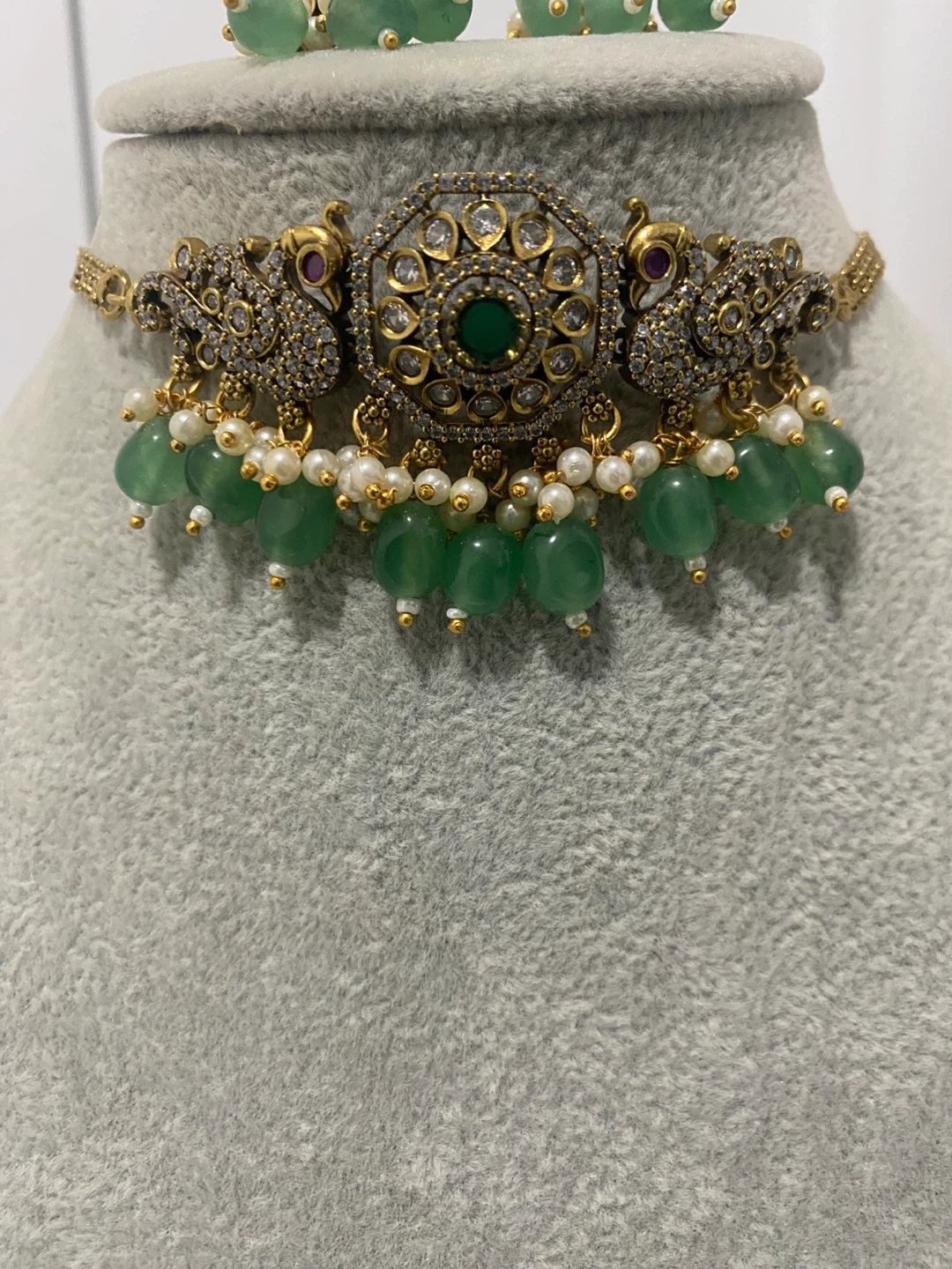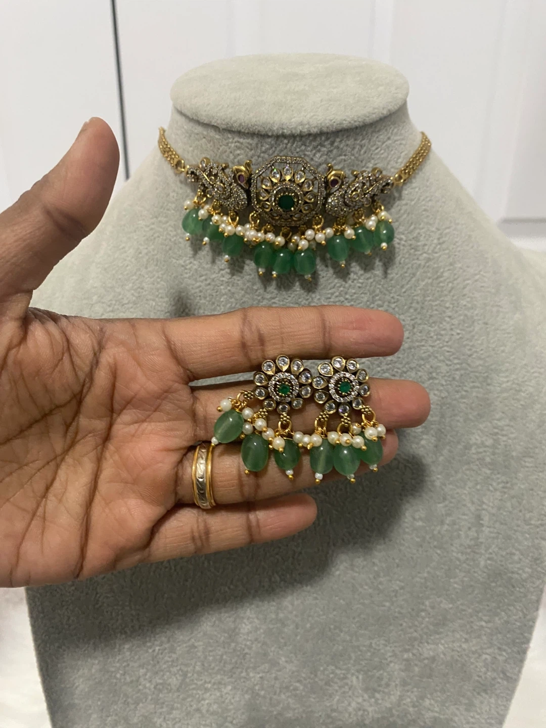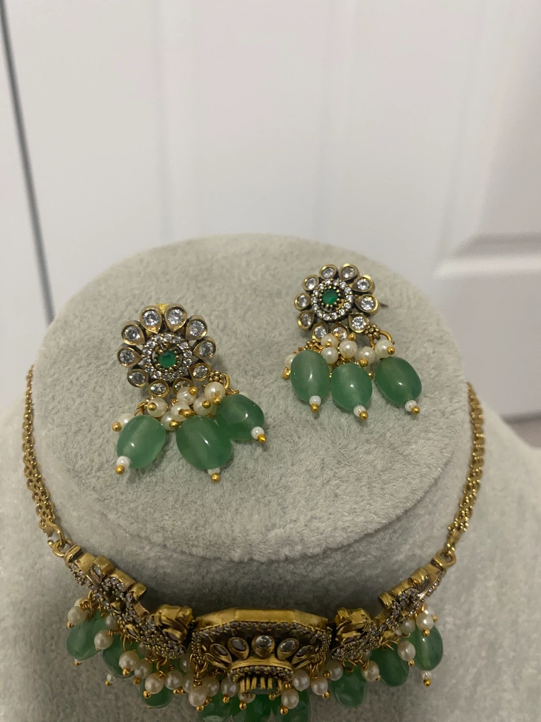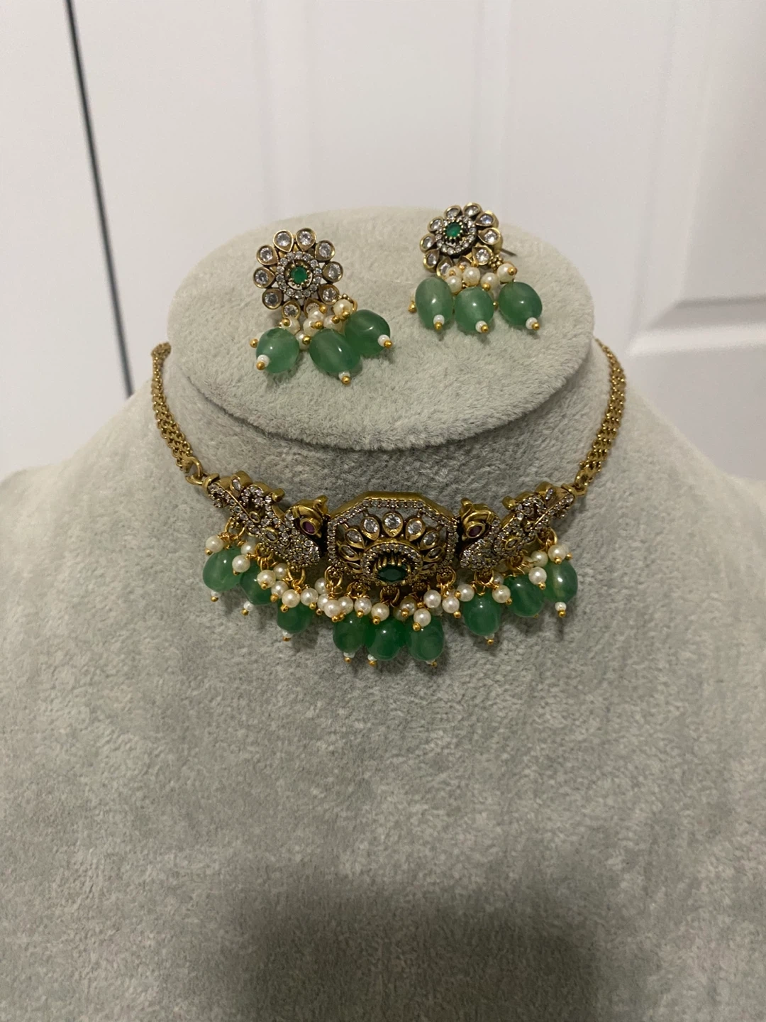 Beautiful necklace and earrings set featuring green jade beads and gold-tone metal detailing. The necklace has an intricate design with what looks like peacocks. The earrings are matching studs with the same green jade and gold accents. A lovely set for adding a touch of elegance to any outfit!