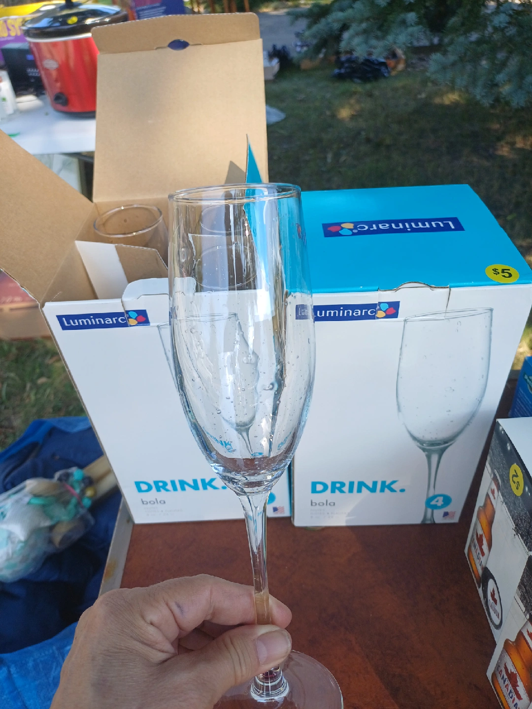 2 sets available: NEW in box- 4 Luminarc Drink Bola flutes! Glass wall shows "bubbles design" The sophisticated pulled stem is both fashionable and functional, and the glass wall enhances visual effects to make each piece truly unique. Each flute holds 8 oz. Each box/set is $4.00