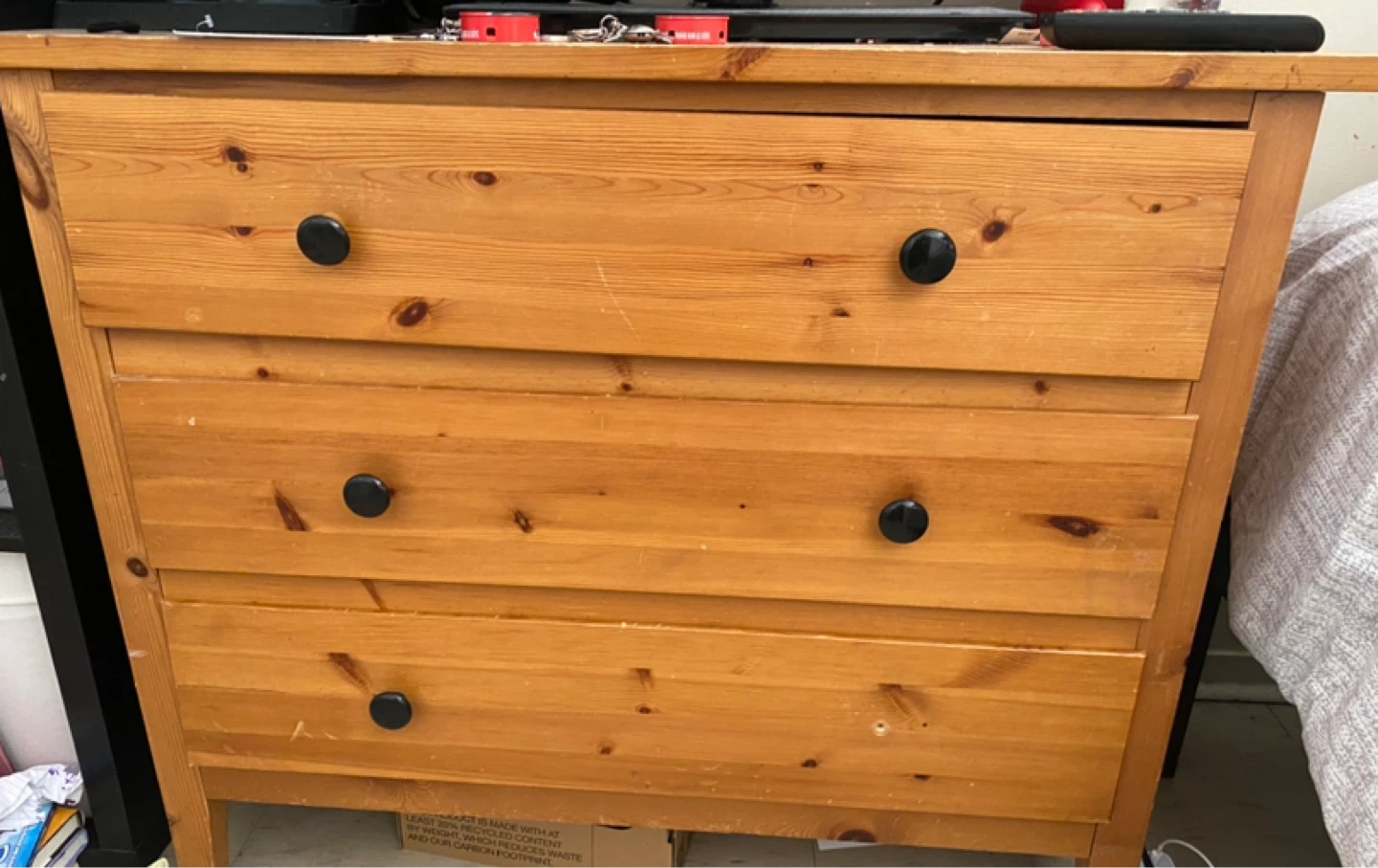 Gently used wooden dresser with three drawers. It has a warm, natural finish and black round knobs. Perfect for adding storage to any bedroom or living space
