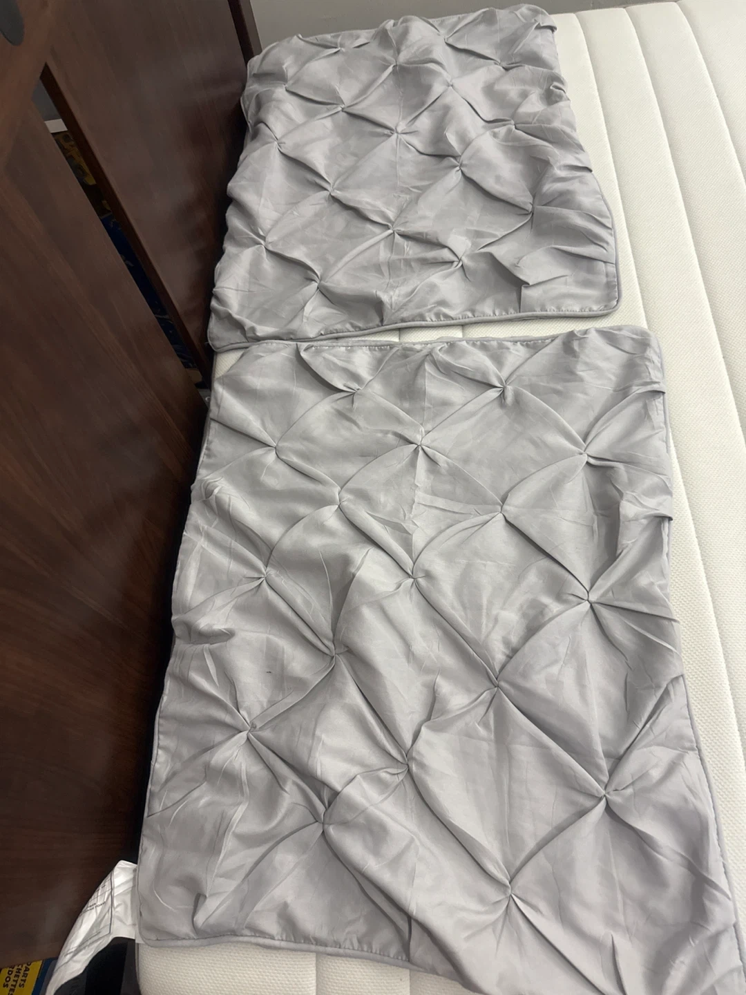 Selling a comforter set in a nice grey colour. It's in great condition and would look great in any bedroom! The material is polyester.