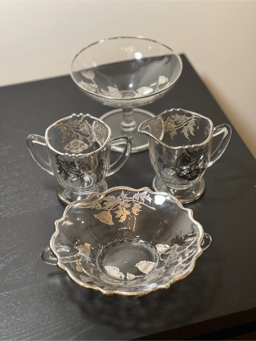This is a beautiful collection of vintage Silver Overlay Glassware, from Silver City Glass Company, known for applying silver decorations to glass blanks.