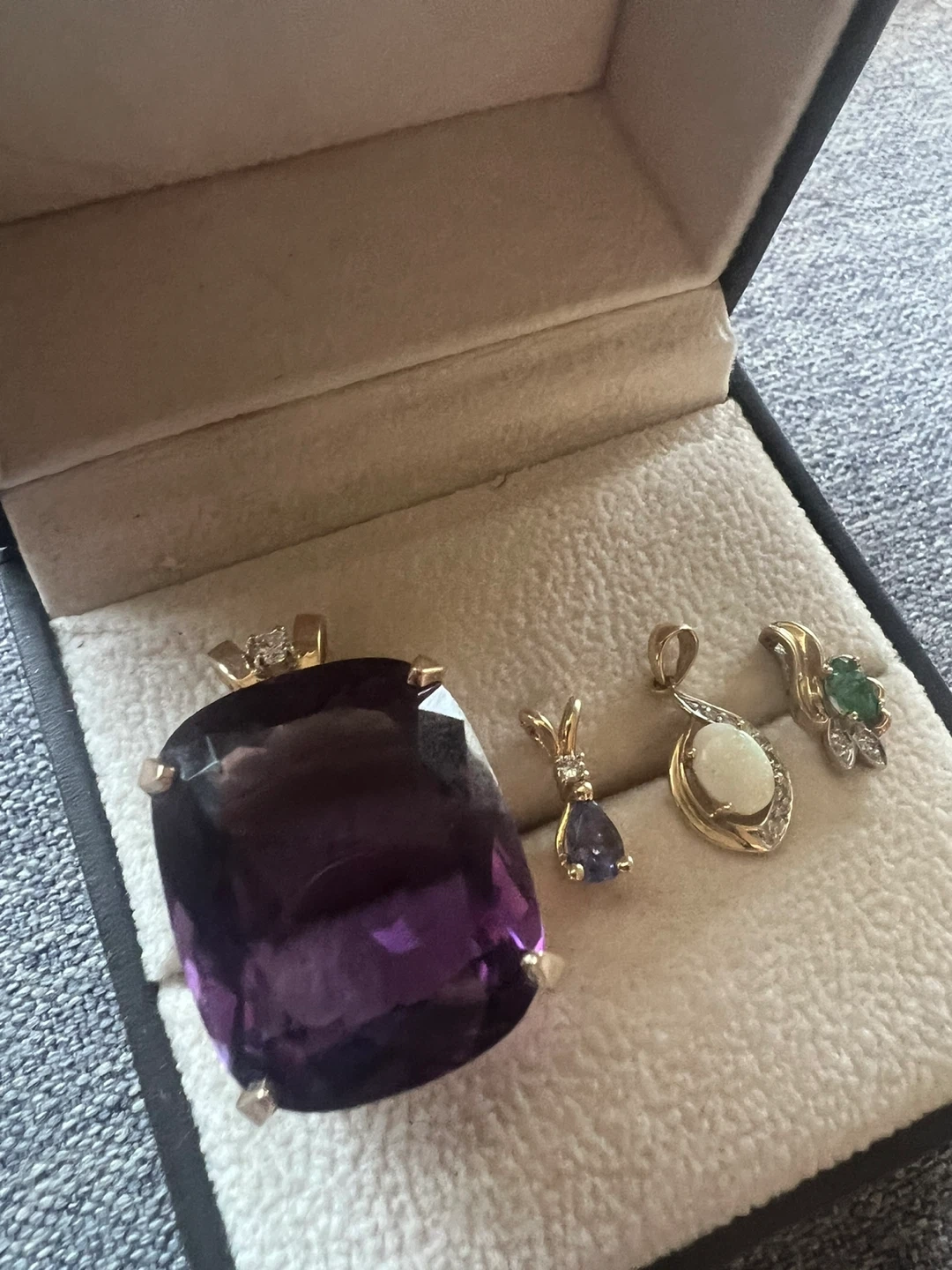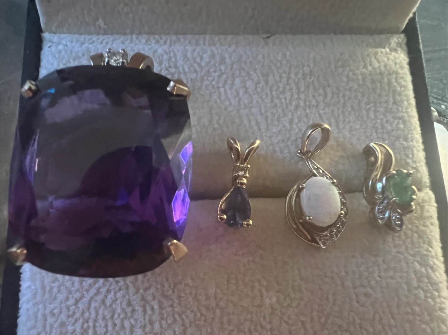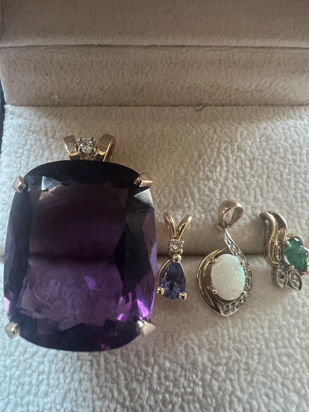 a large 14 k amethyst and 1 diamond pendant -675 dollars ( 16.4 grams ) ; a small 10 k tanzanite and 1 diamond pendant -165 dollars ; 14 k opal and diamonds pendant -260 dollars ; and 10 k emerald and 1 diamond pendant -165 dollars They would be a lovely addition to any jewellery collection!