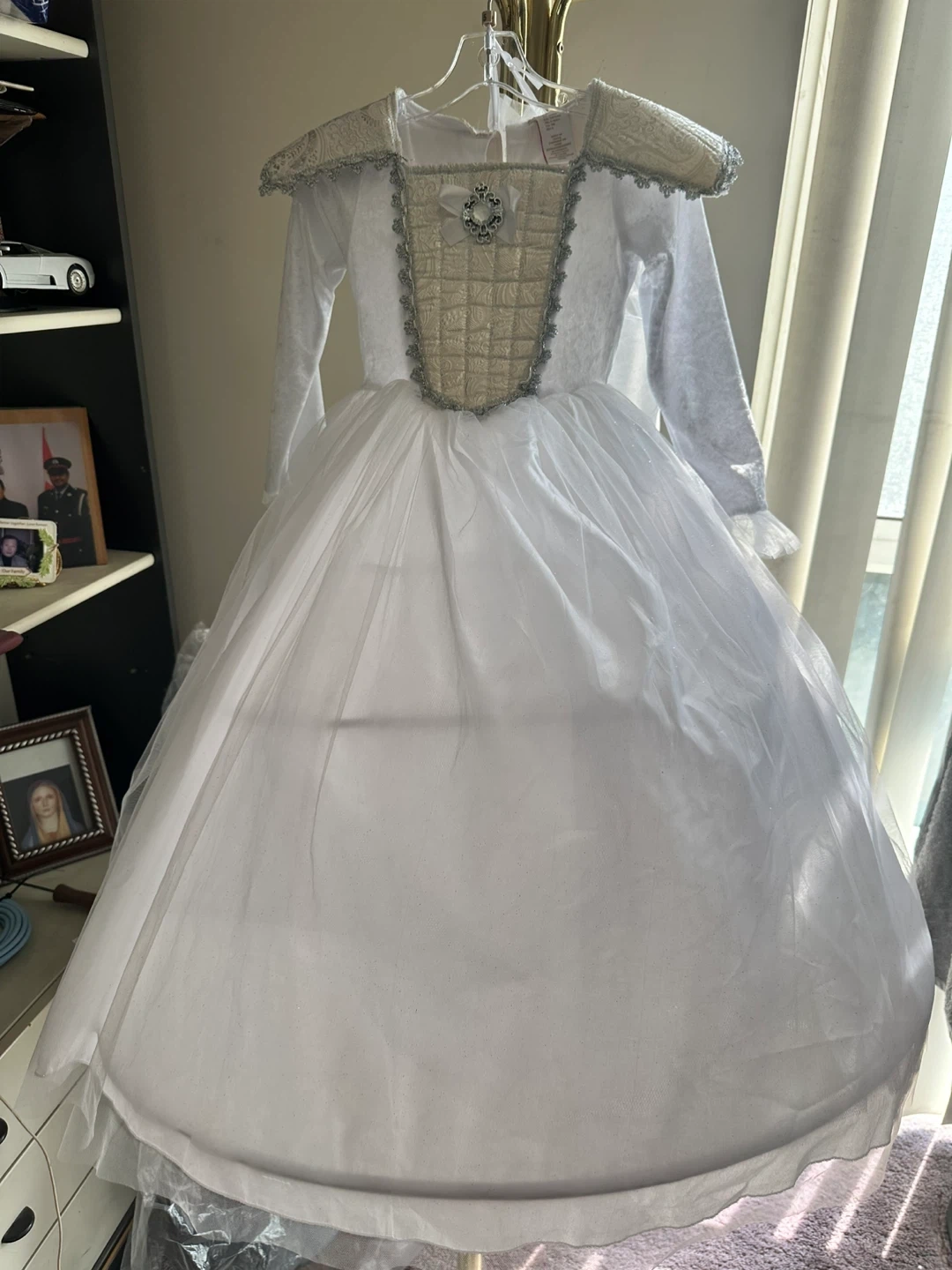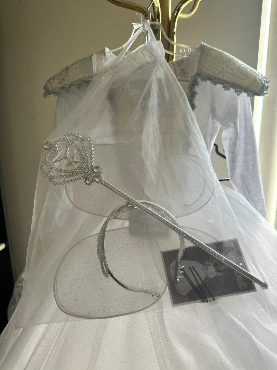 Selling a beautiful princess dress, perfect for dress-up or a special occasion! It comes with a matching wand and tiara to complete the look. It's in great condition and ready for a new home