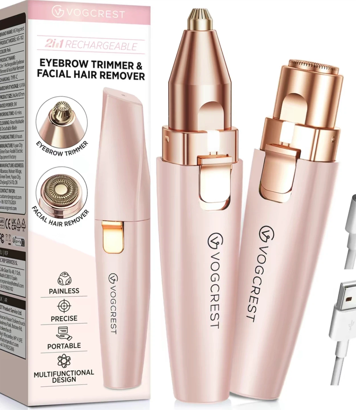 I'm selling a brand new, unboxed Vogcrest 2in1 rechargeable eyebrow trimmer and facial hair remover in pink! It features a Type-C charging port and has a working time of 45 minutes. It's designed to be painless, precise, portable, and multifunctional. The trimmer is rinse washable and has a detachable blade