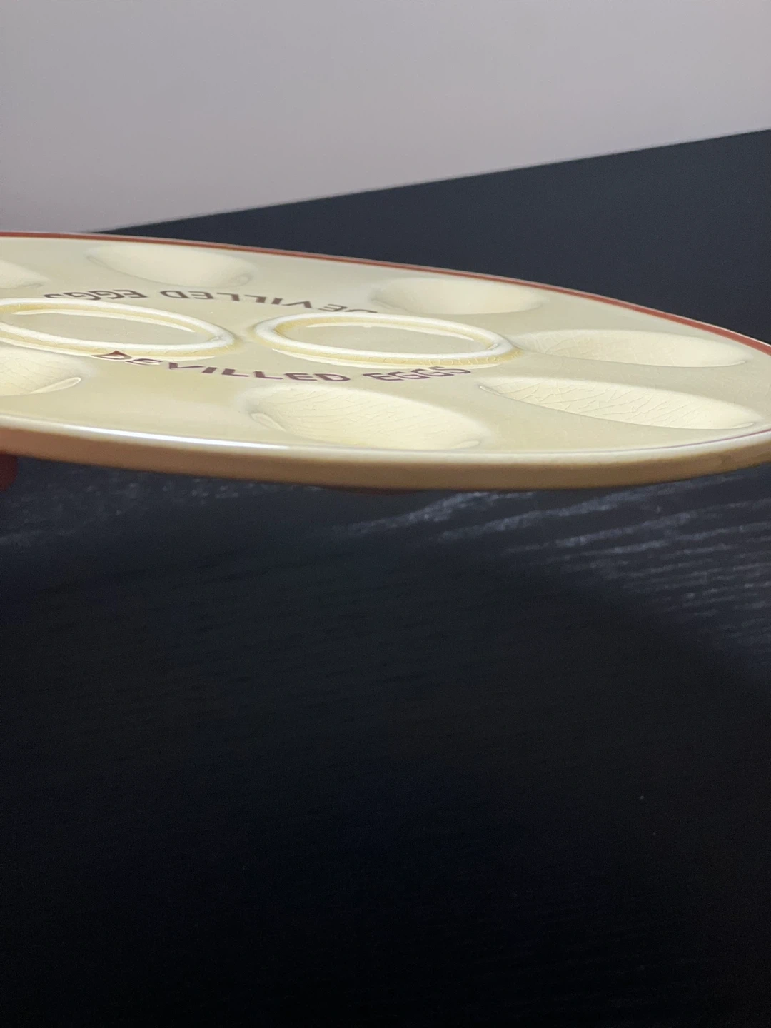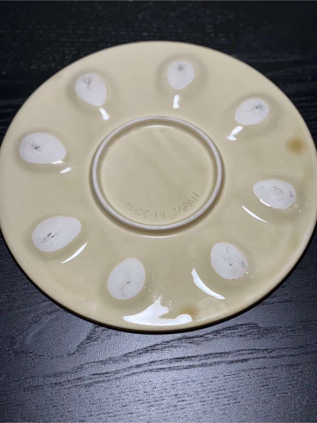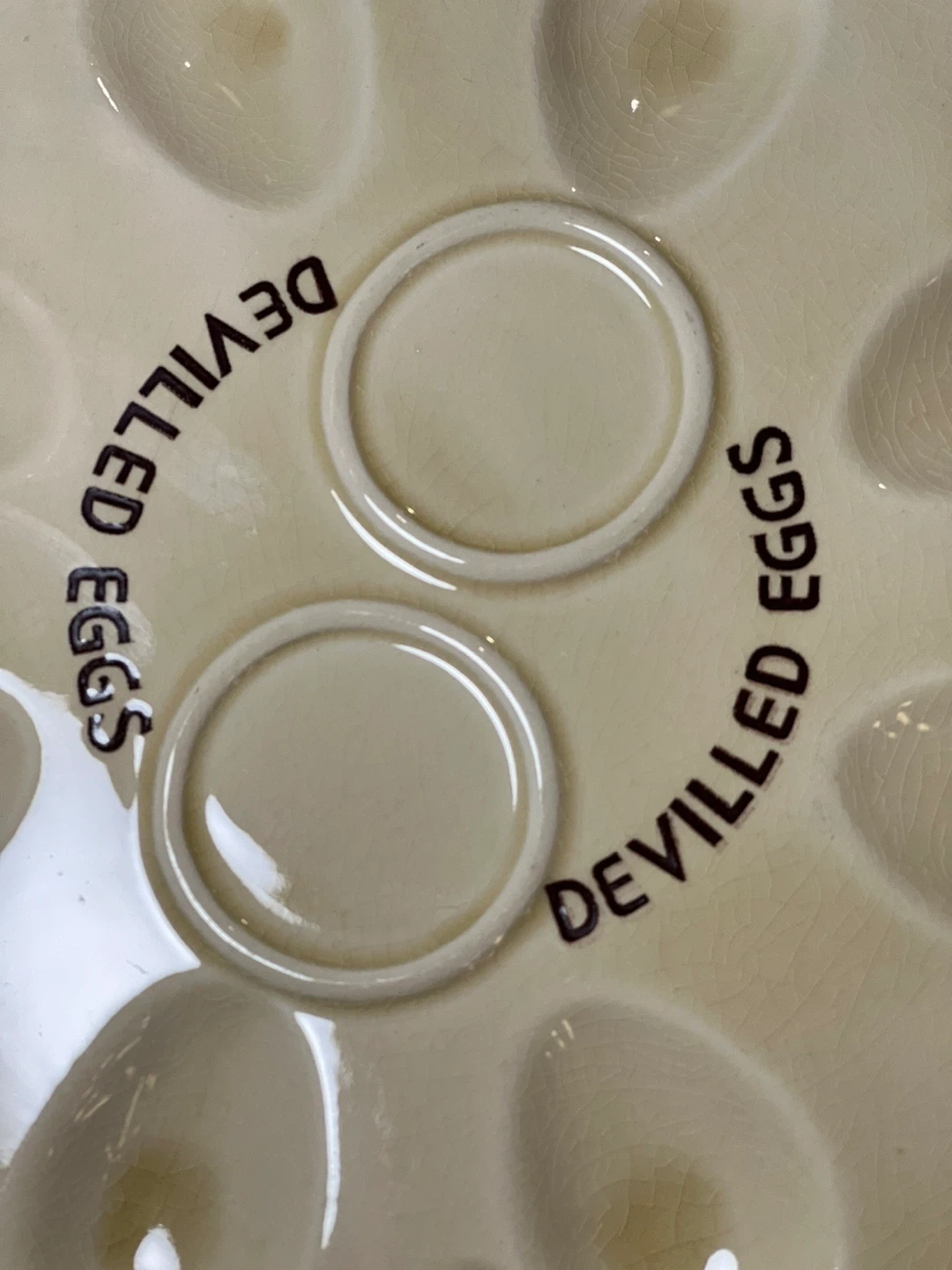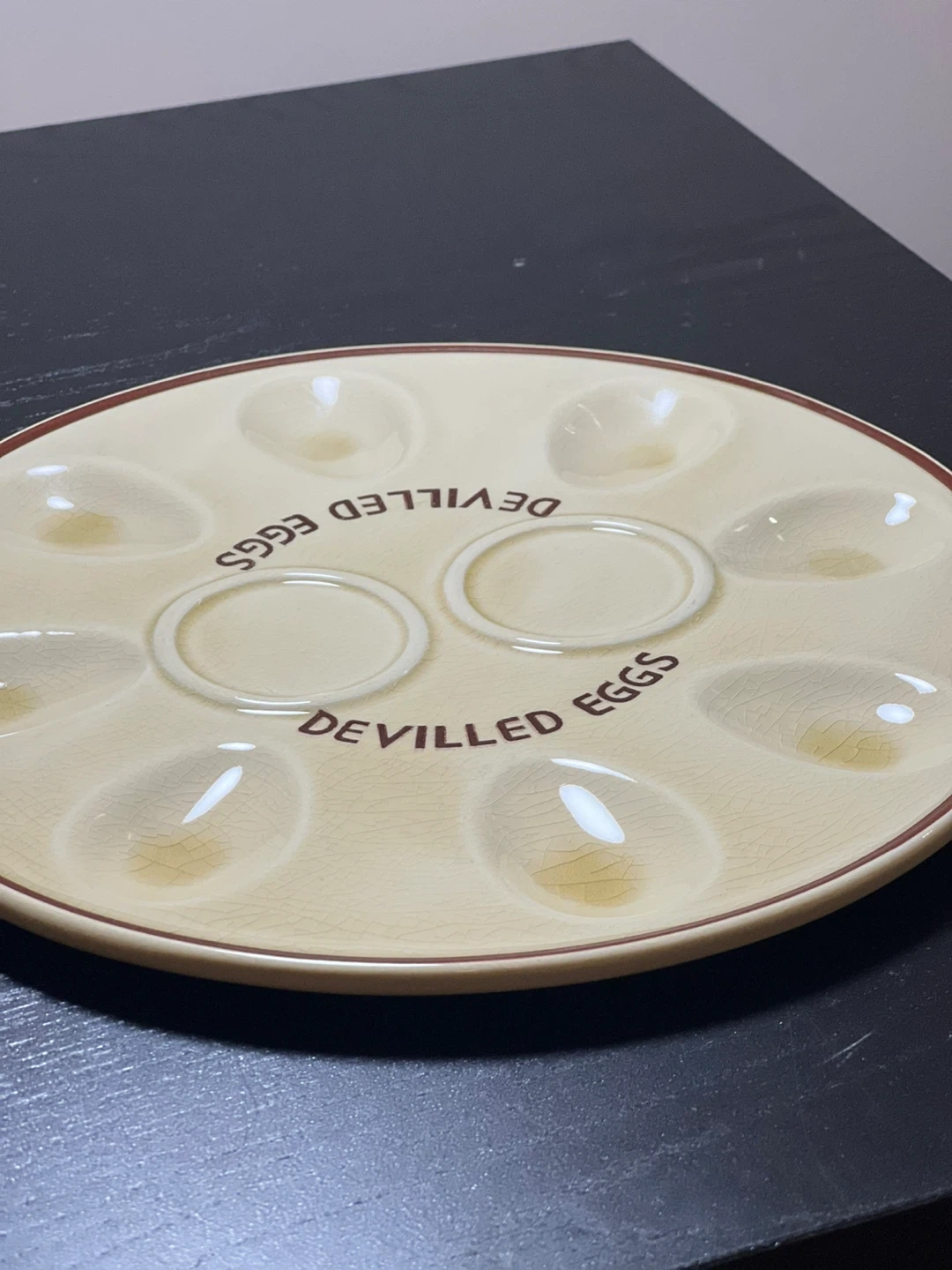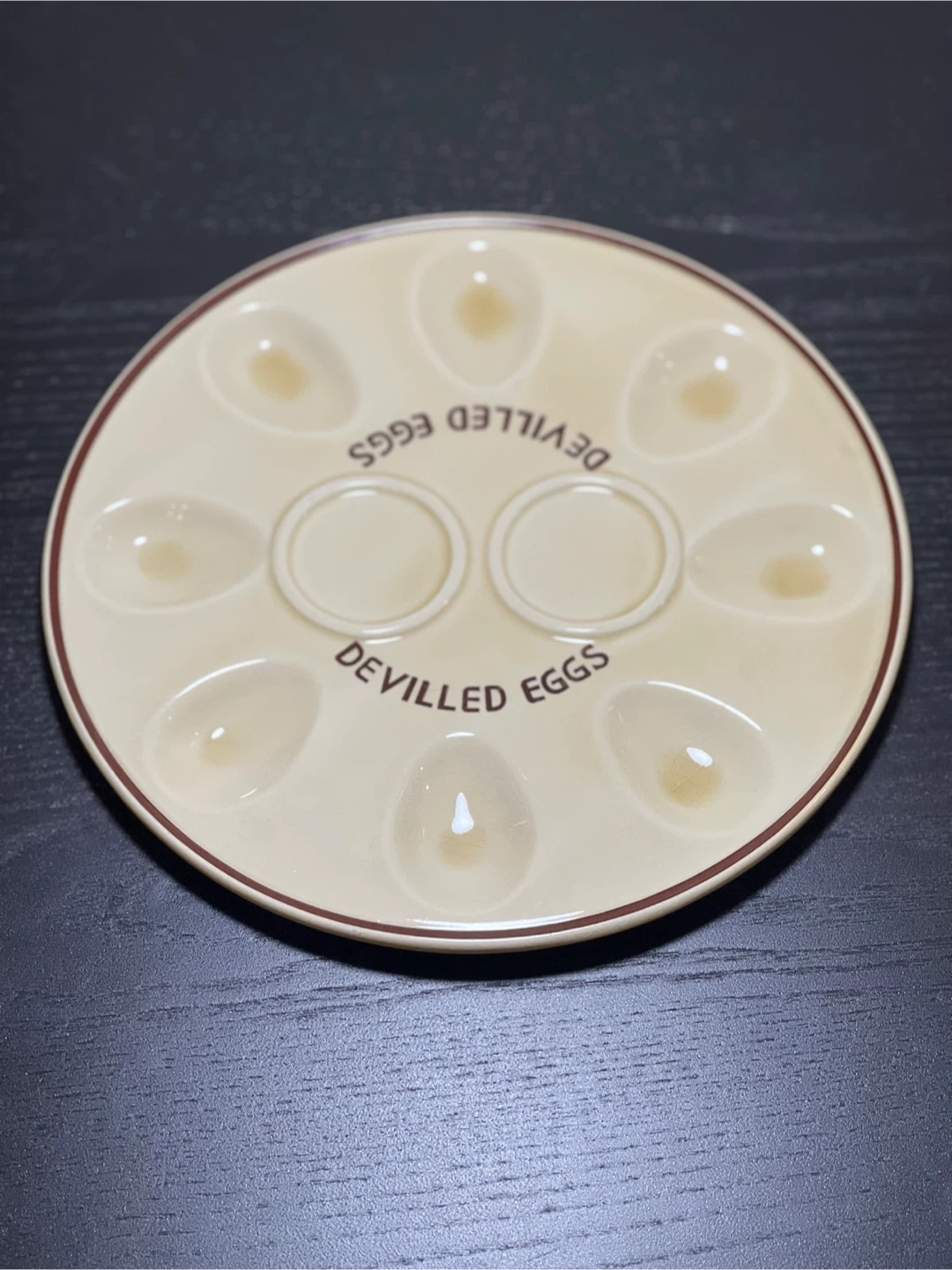 Selling this charming vintage ceramic devilled eggs plate perfect for showcasing your delicious devilled eggs. This plate is not only functional but also adds a touch of nostalgic elegance to your table setting. Cream-colored ceramic with a brown rim, featuring 8 oval indentations for holding deviled egg halves. Two circular spaces in the center for garnishes or additional ingredients. Embossed with "MADE IN JAPAN" on the bottom, indicating its high-quality craftsmanship and vintage appeal. - **Diameter**: Approximately 9 inches