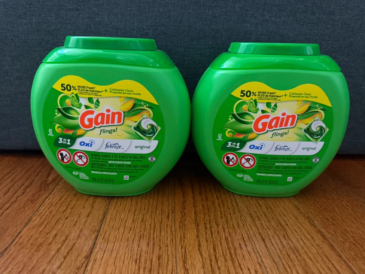 Selling a container of Gain Flings! laundry detergent pods. These are the original scent and contain Oxi and Febreze. Each container has 42 pods. They offer 50% more freshness and are designed for coldwater cleaning