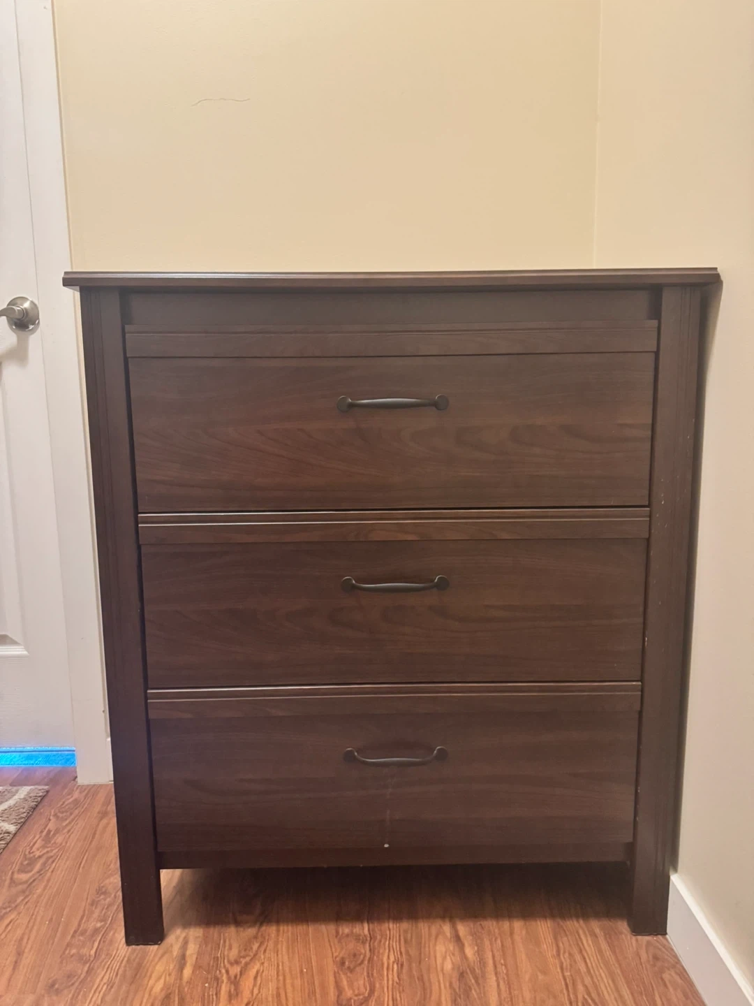 Selling a lovely brown wood three-drawer dresser! It's in good condition and perfect for adding some extra storage to your bedroom or any other space in your home! I have 2 of them