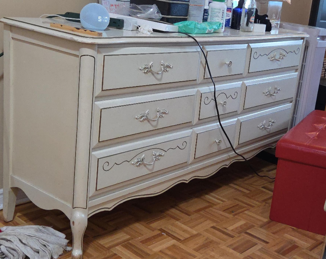 Selling a lovely cream dresser with a vintage-inspired design! It has multiple drawers for ample storage and a unique decorative trim. Perfect for adding a touch of elegance to any room! Has a few small scratches, which can be painted. Made of real good quality wood; all drawers open smoothly and are functional.)