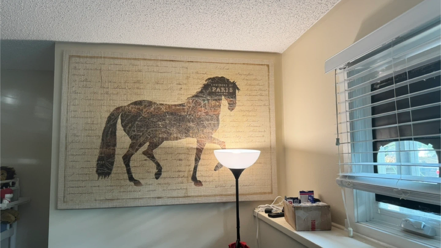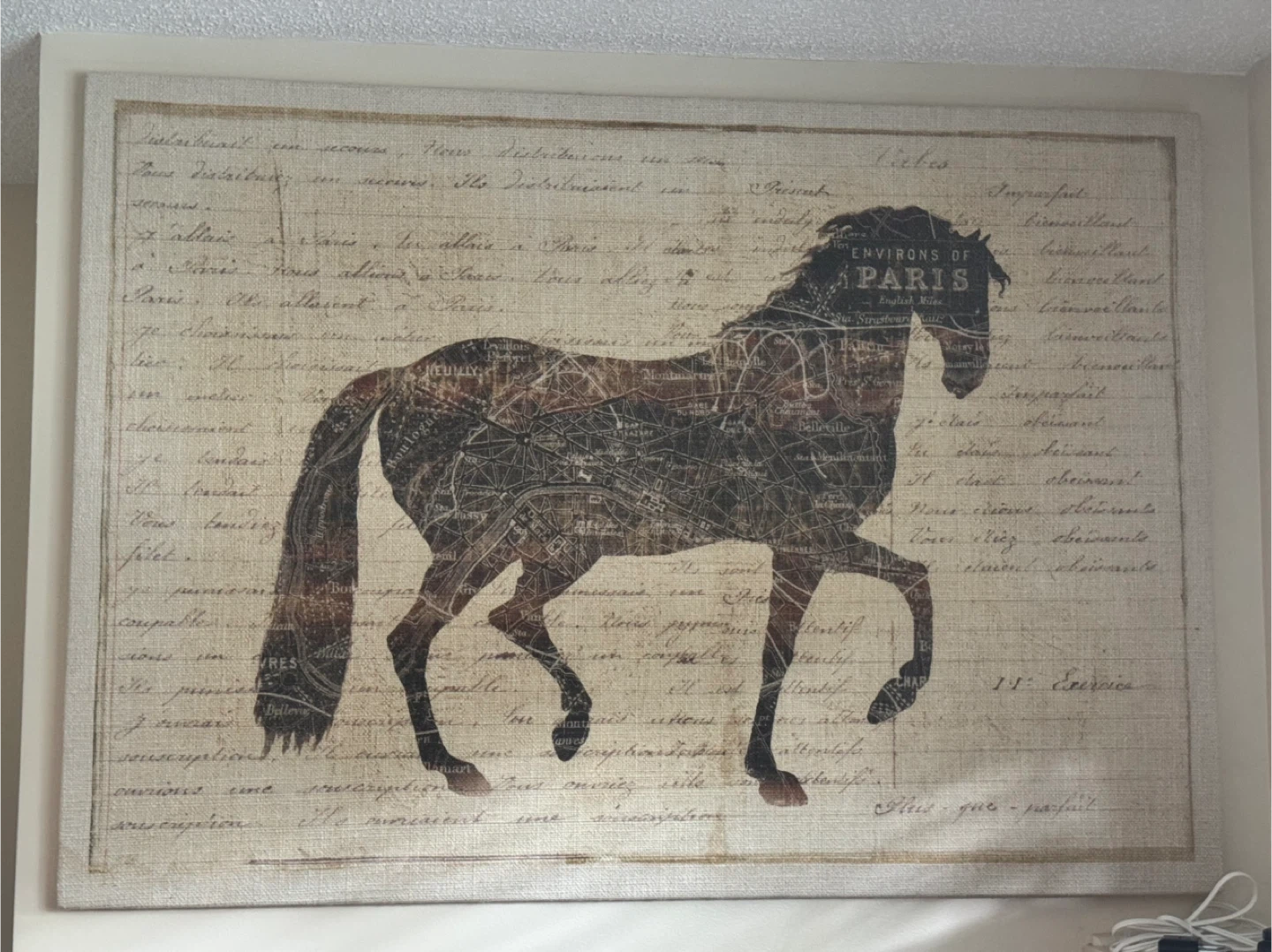 Add a touch of Parisian charm to your home with this lovely canvas wall art! It features a horse silhouette filled with a map of Paris, set against a background of French script. Perfect for adding a unique and stylish touch to any room…