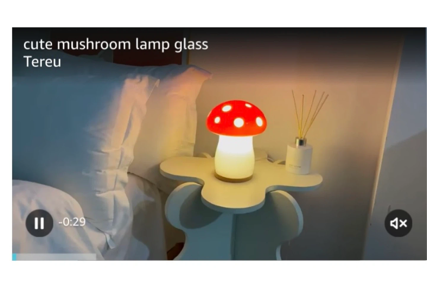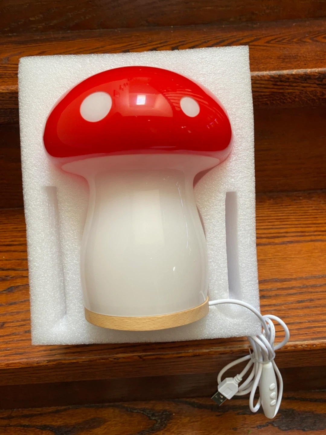 Add a touch of whimsy to your space with this adorable mushroom lamp! It features a red and white polka dot design on top and a soft, glowing base. The lamp is in excellent condition and comes with its original box. This exclusive design is sure to brighten up any room!