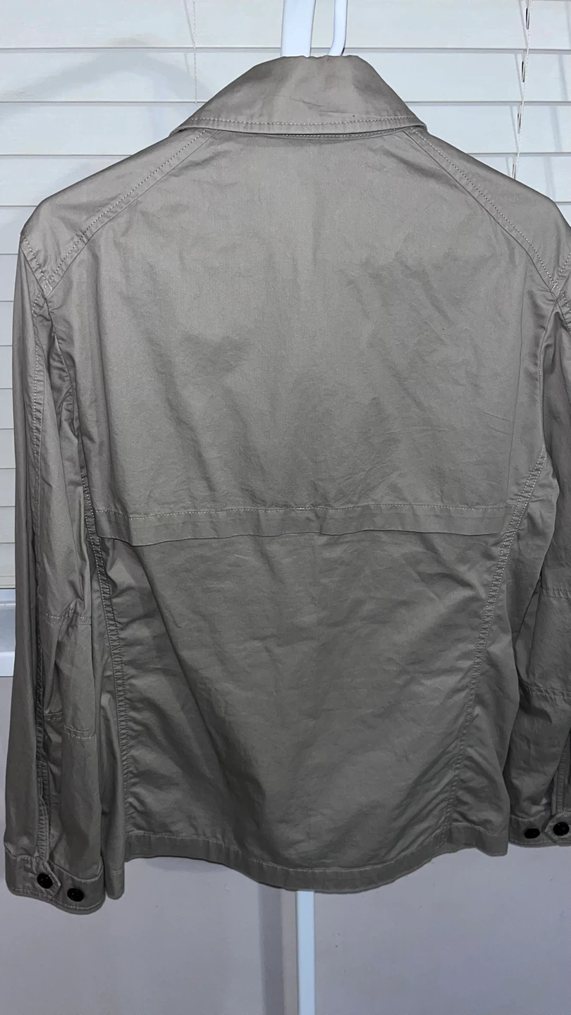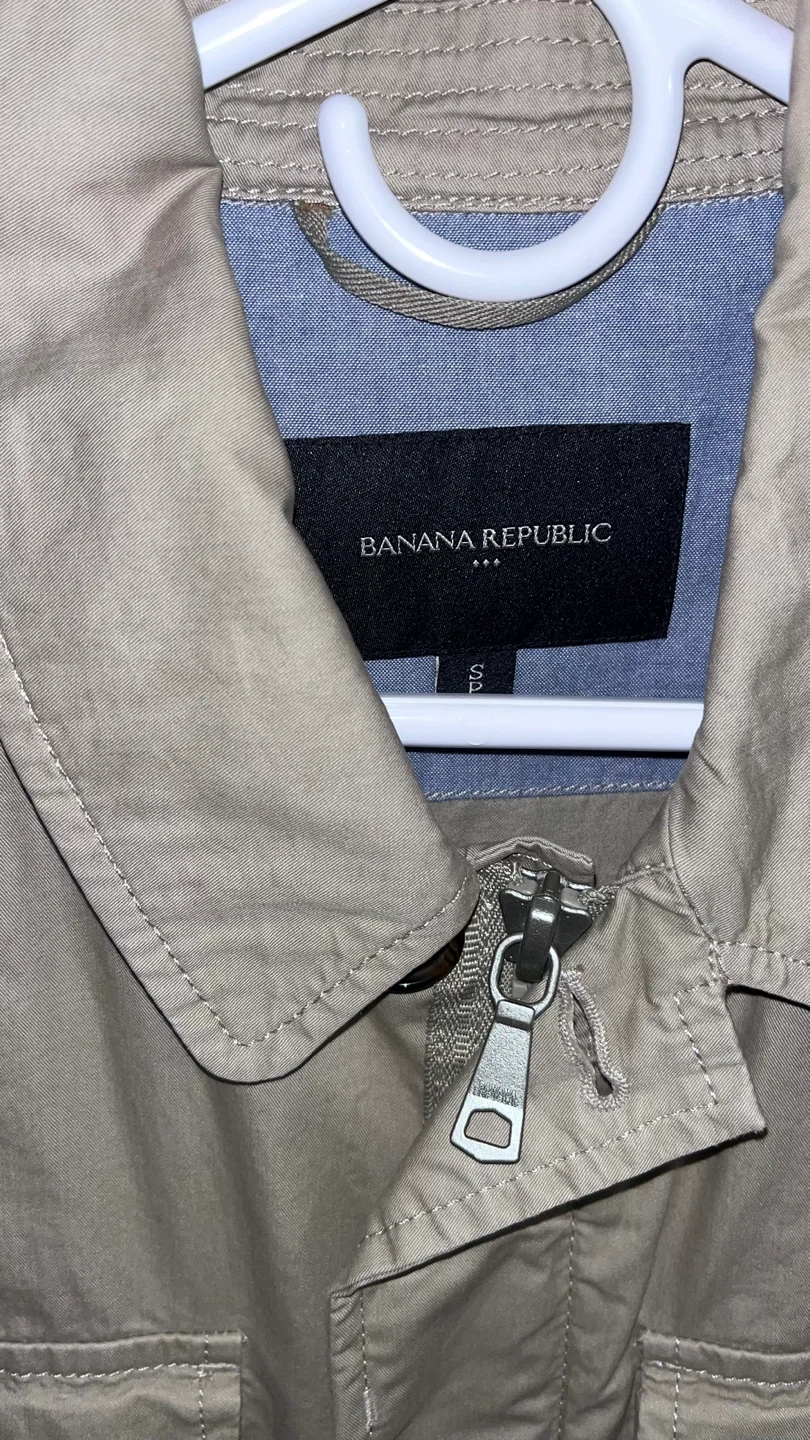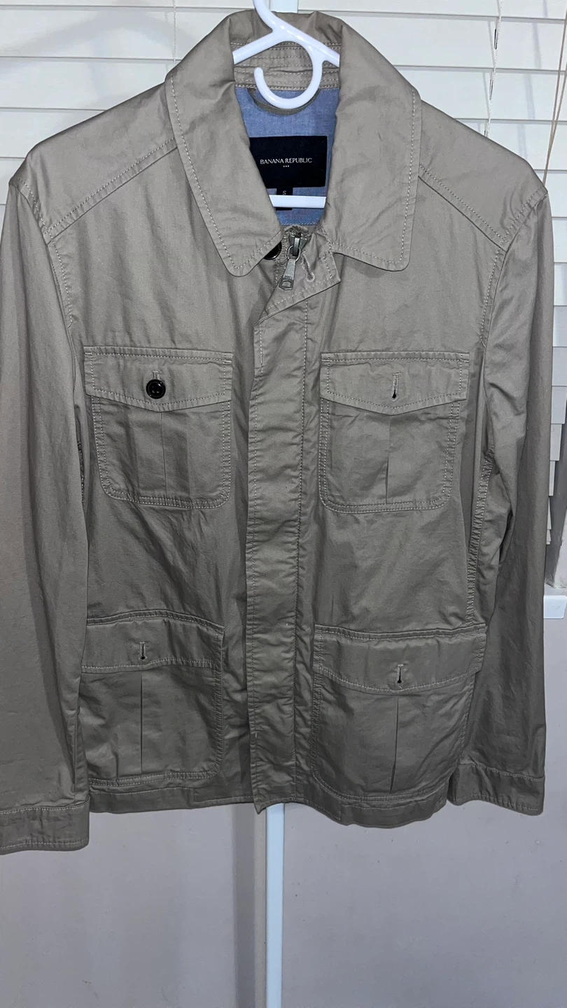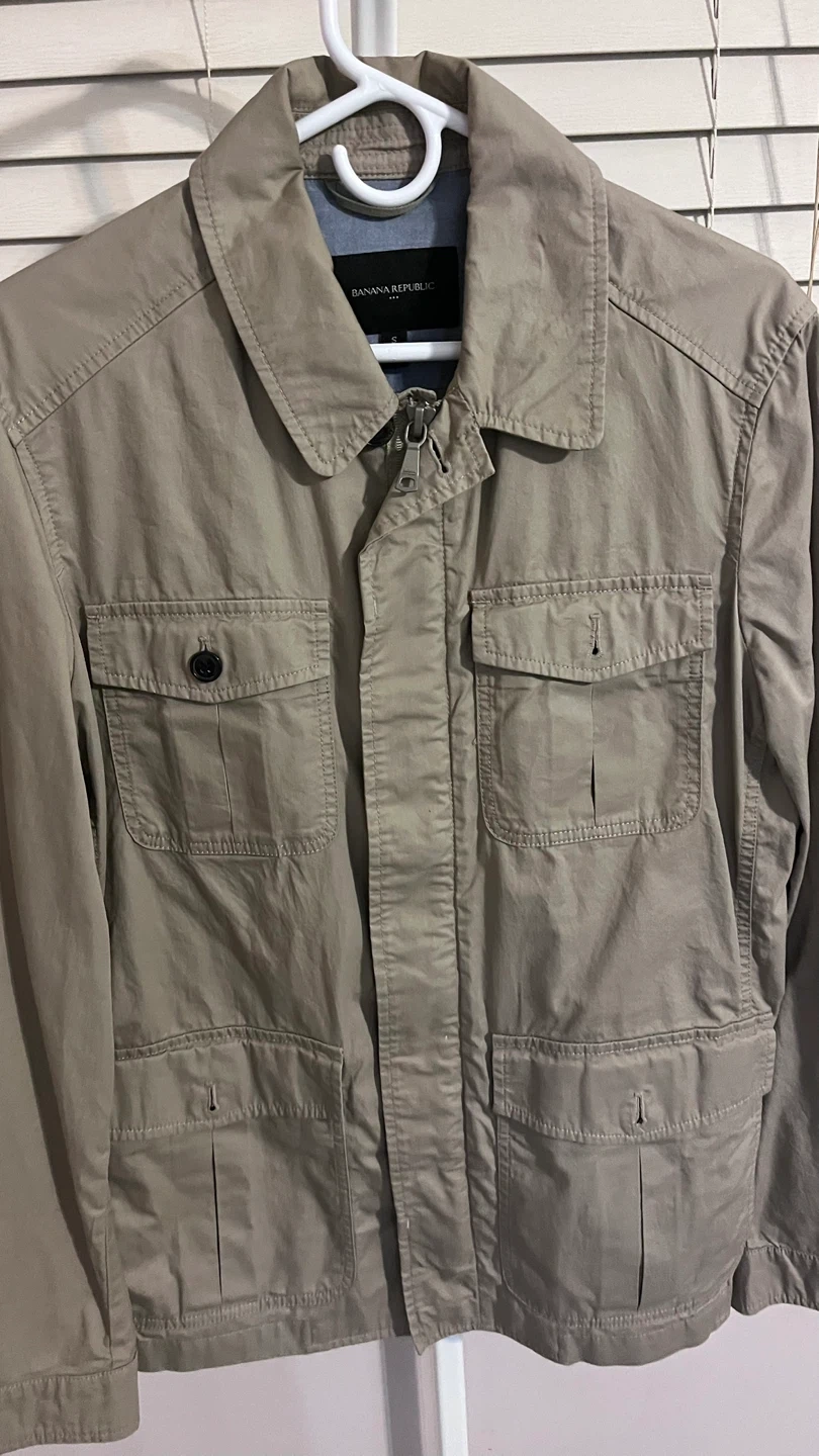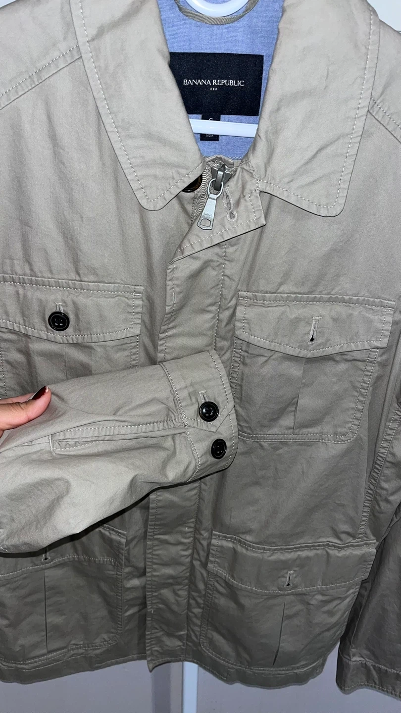 This is a Banana Republic jacket in a neutral beige colour. It features a classic design with multiple pockets, perfect for a casual yet stylish look. It's in great condition and ready for a new home!