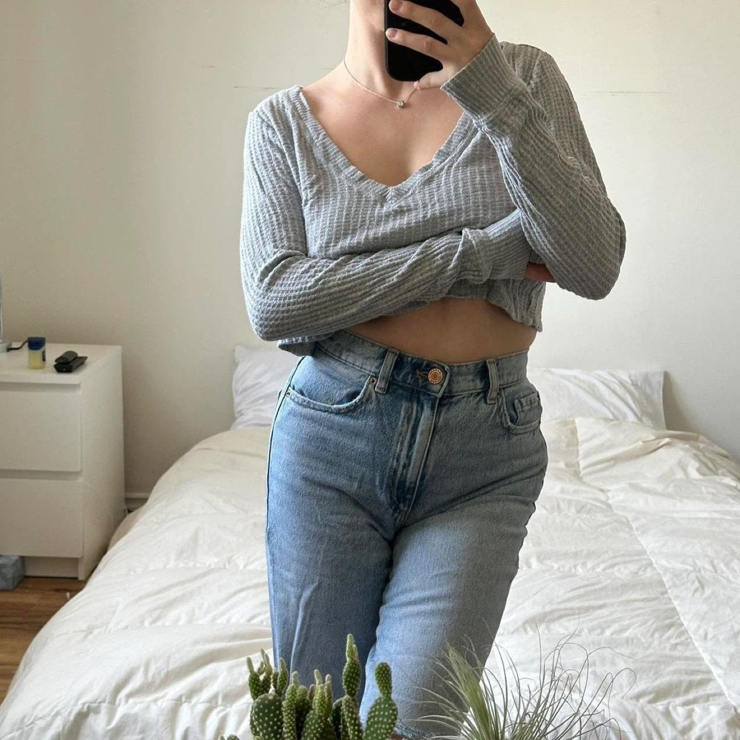 light grey, cropped top, long sleeve, knit texture, casual, fitted, minimalistic, airy, everyday wear, chic