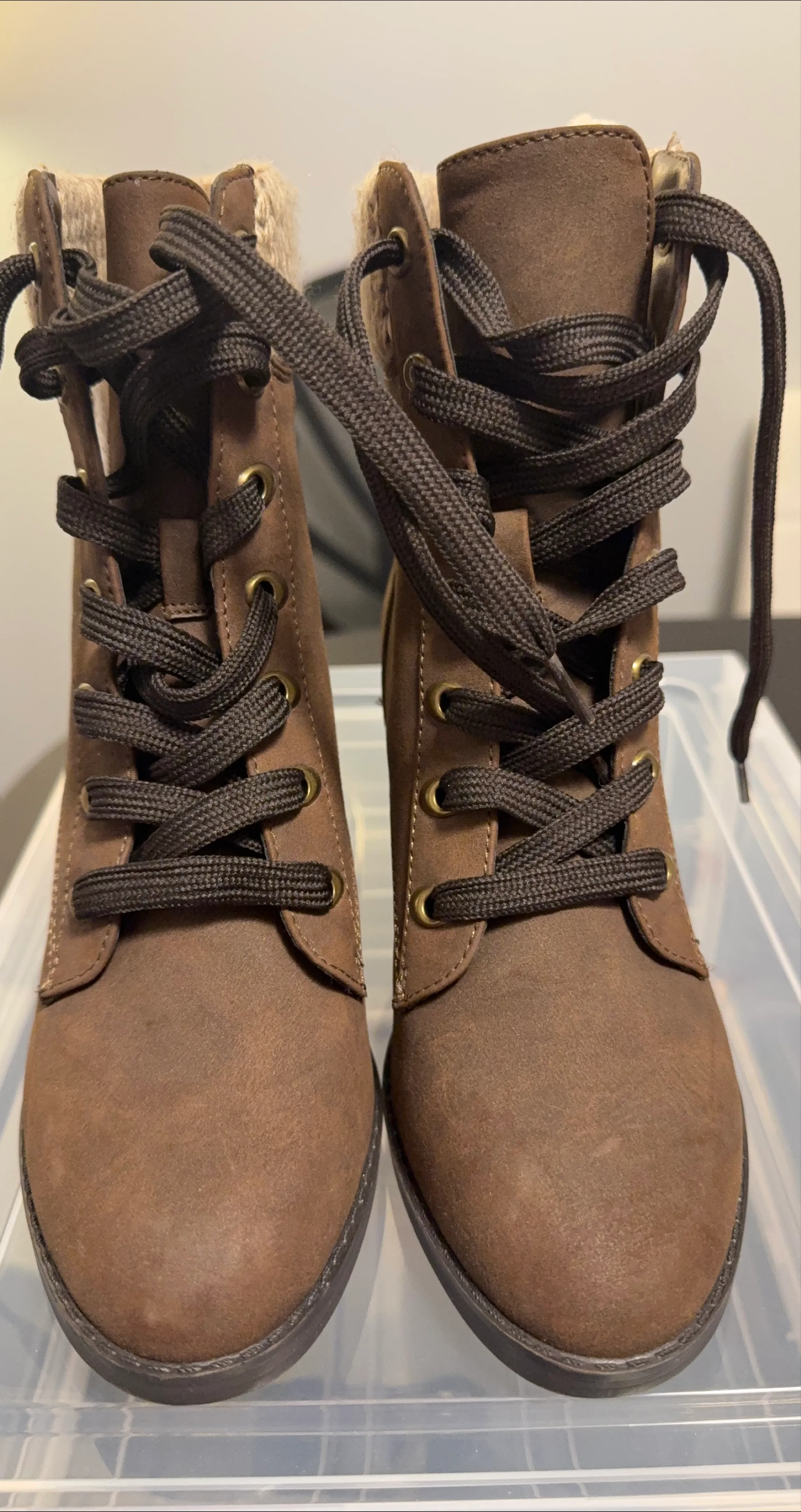 Cute brown heeled boots from Call It Spring! They're a size 6 and in great condition. Perfect for fall or winter, these boots have a stylish look and comfortable heel height