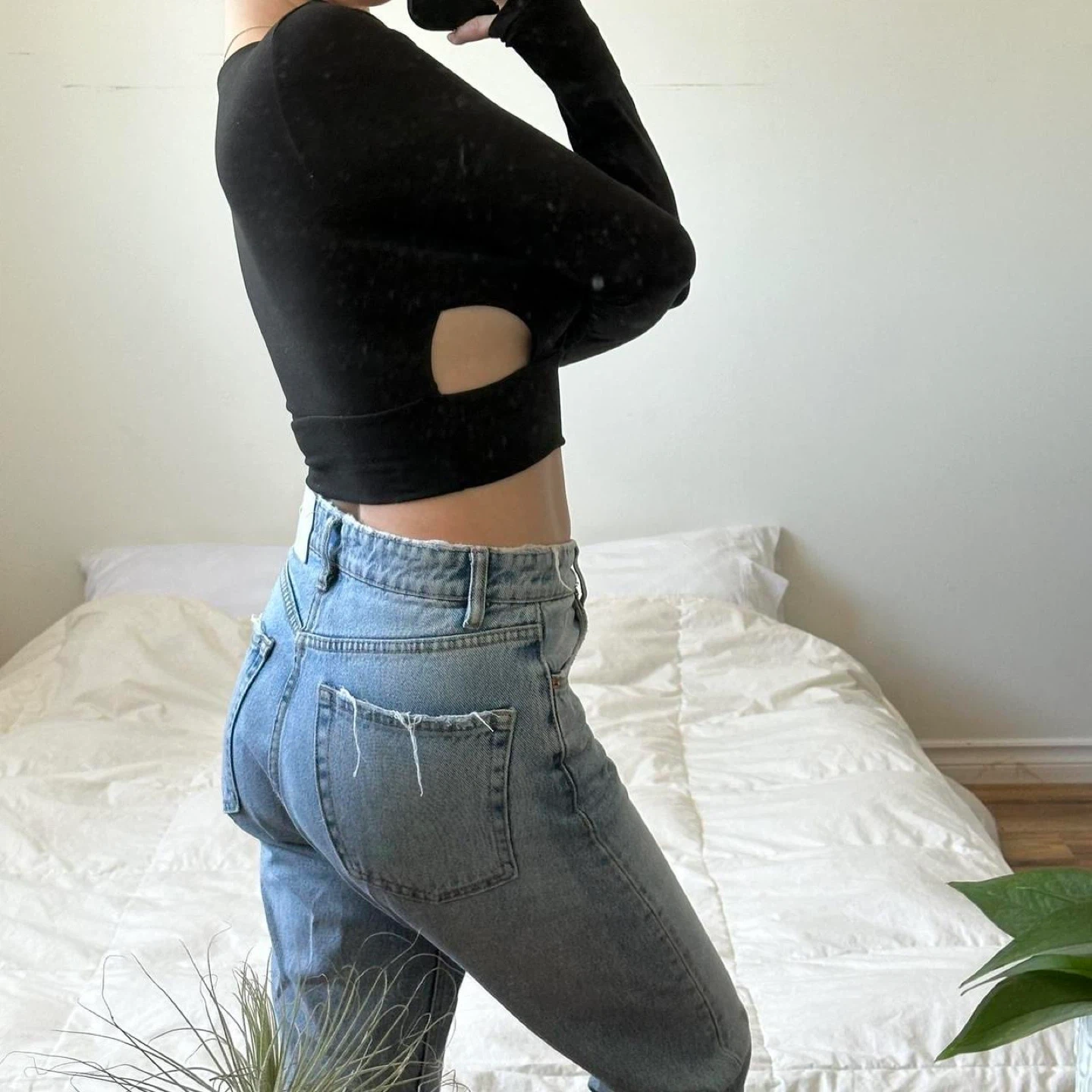 black crop top, long sleeve, cut out detail, fitted, bodycon, trendy, streetwear, casual, minimalist, versatile