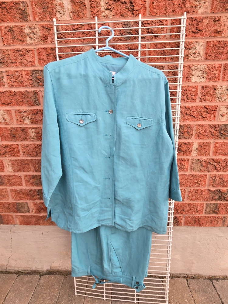 A lovely turquoise linen pant suit, perfect for spring or summer! The jacket has a mandarin collar and two front pockets. The pants are a classic cut with button details at the waist. A great addition to your wardrobe!
