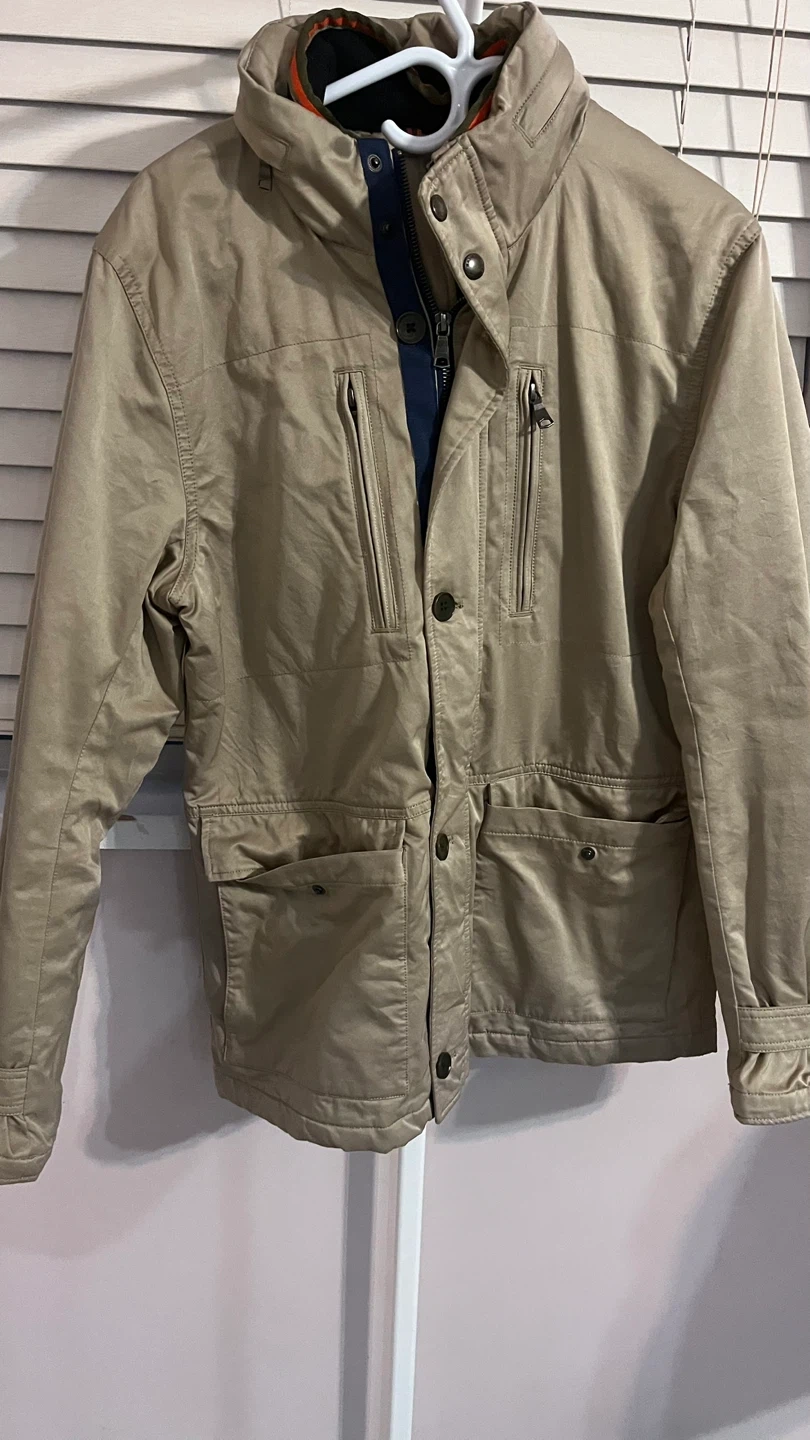 Banana Republic jacket in great condition! It's a men's size M/M. The jacket features a zipper and button closure, with multiple pockets for convenience. Perfect for cooler weather!