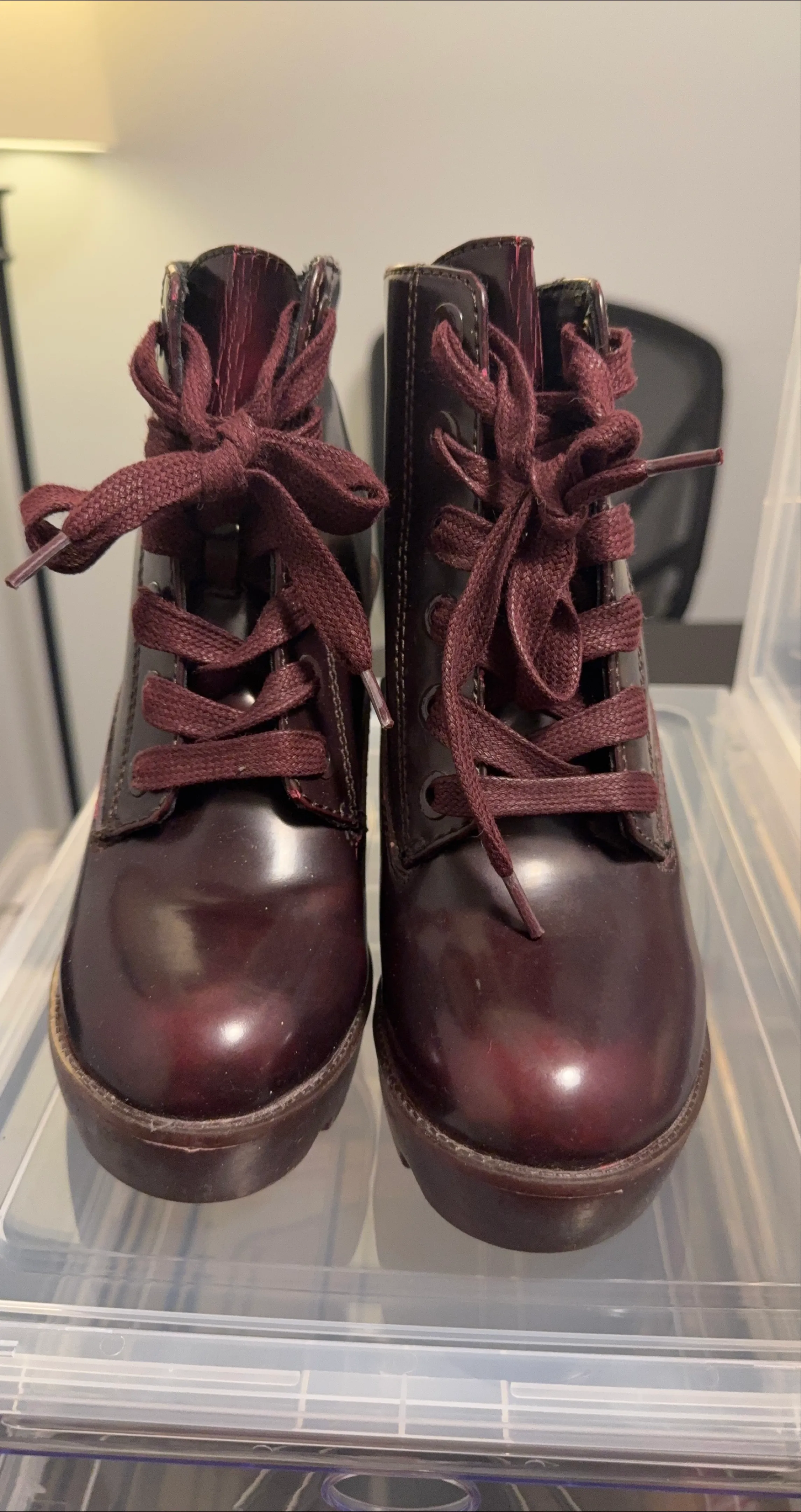 These Aldo burgundy heeled boots are in great condition! They are a stylish addition to any wardrobe. The boots feature a lace-up front and a chunky heel for added height and comfort. Perfect for dressing up or down!used gently AS-IS.