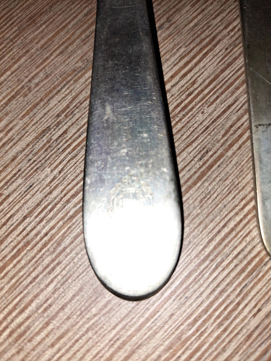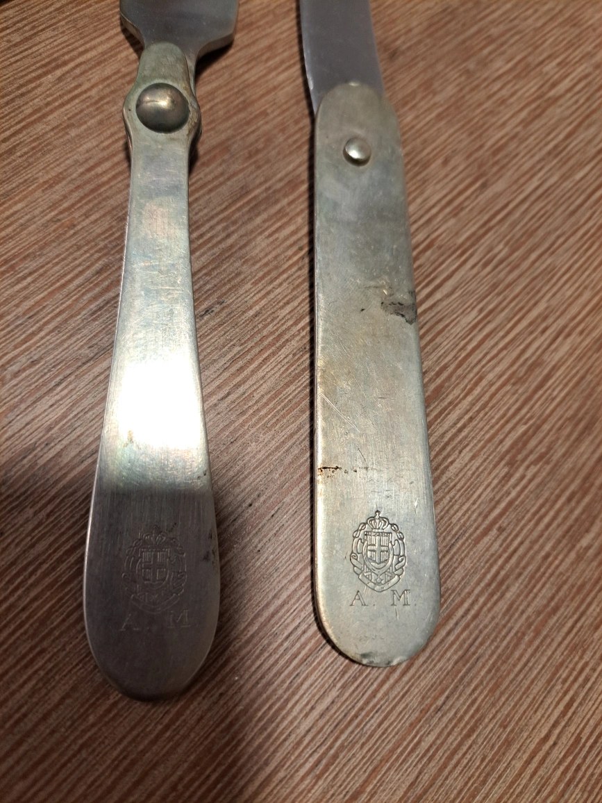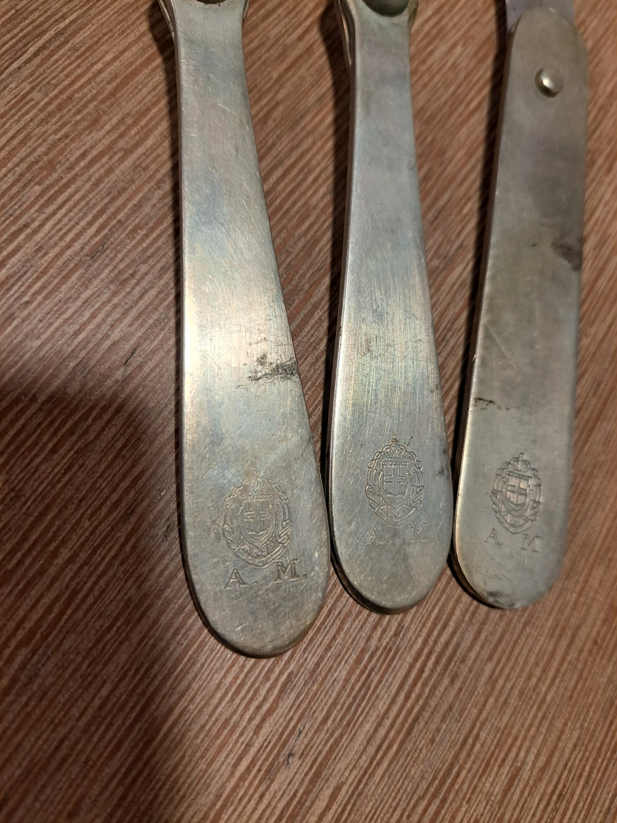 Selling a vintage silverware set including a spoon, fork, and knife. Each piece has a unique design. Perfect for collectors or anyone looking to add a touch of vintage charm to their dining experience